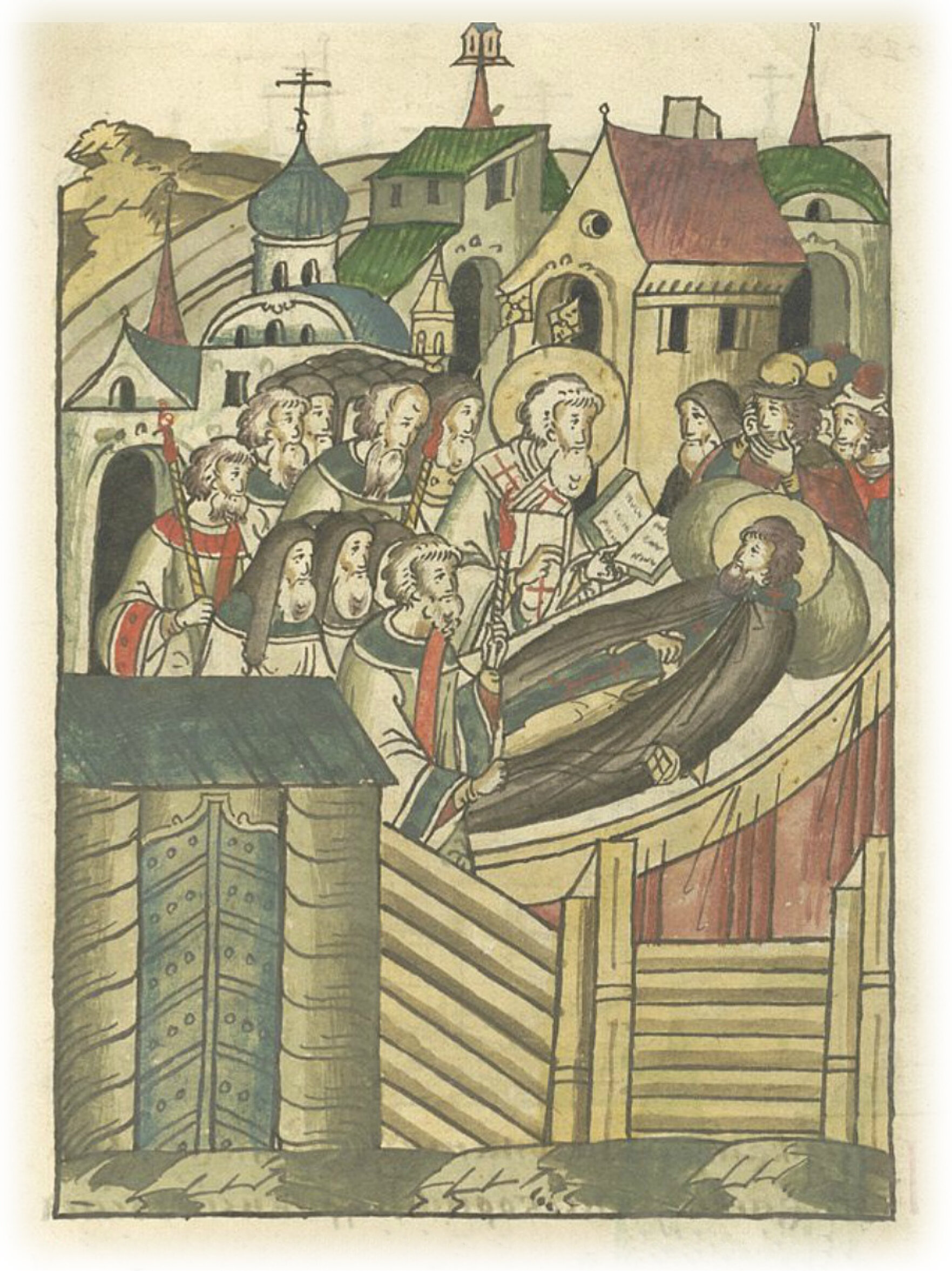 Блаженный же епископ Арсений собрал весь собор. И сошлись со всего города архимандриты и игумены, попы и дьяконы, зажгли свечи и кадила и в светлых ризах пришли к одру блаженного и благородного Матфея.