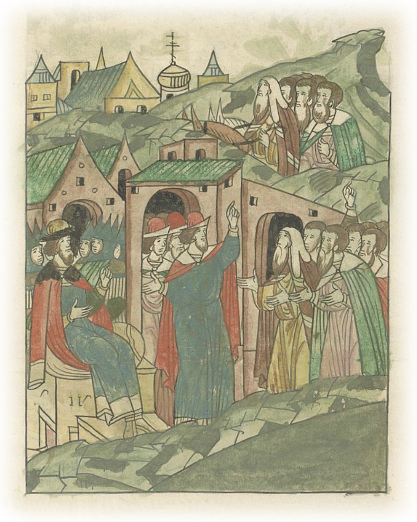 И владыка со всеми своими посадниками и зажиточными мужами начали бить челом, чтобы князь великий пожаловал, разрешил в город ехать, да о том подумать, да по той же охранной грамоте велел бы у себя быть; а срок бы дал, когда им у себя велит быть. И князь великий позволил им это, а на третий день у себя велел быть им, в воскресенье.