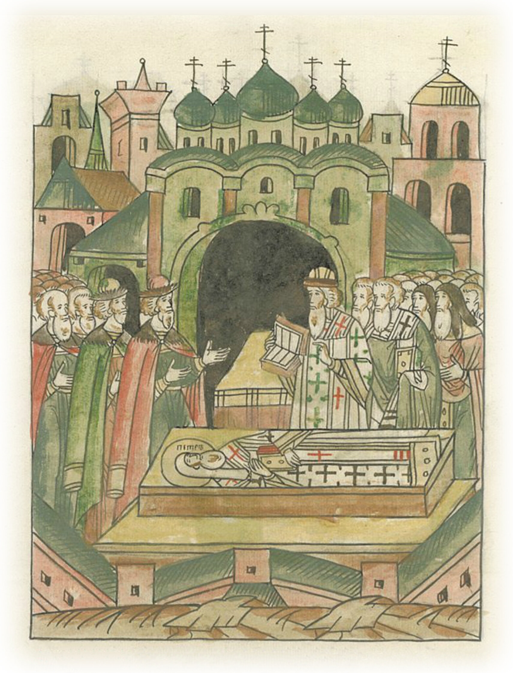 После того же и князь великий пришел со всеми прежденазванными. И начал митрополит молебен Петру чудотворцу, и когда пришло время тропарей, которые читаются перед последней ектеньей,