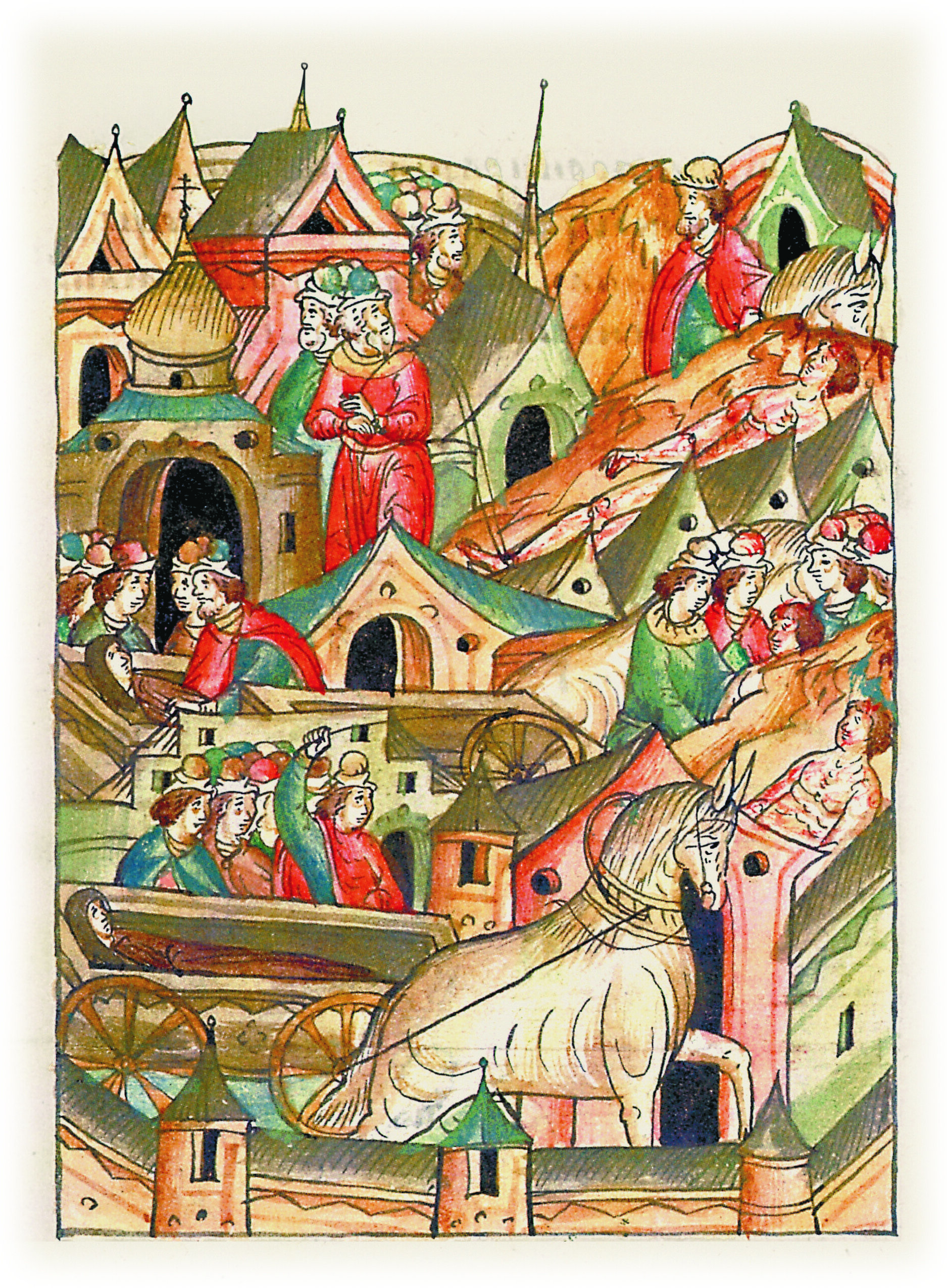 И в то время сбежал от них князь Михалко. Князя же инока Игоря Олеговича убили, подцепили его веревкой за ноги и потащили его через Бабий торг, затем, придя на Великий торг к мраморной церкви пречистой Богородицы, положили его на телегу и, привезя на Подол, повергли его, нагого, на Торговище.