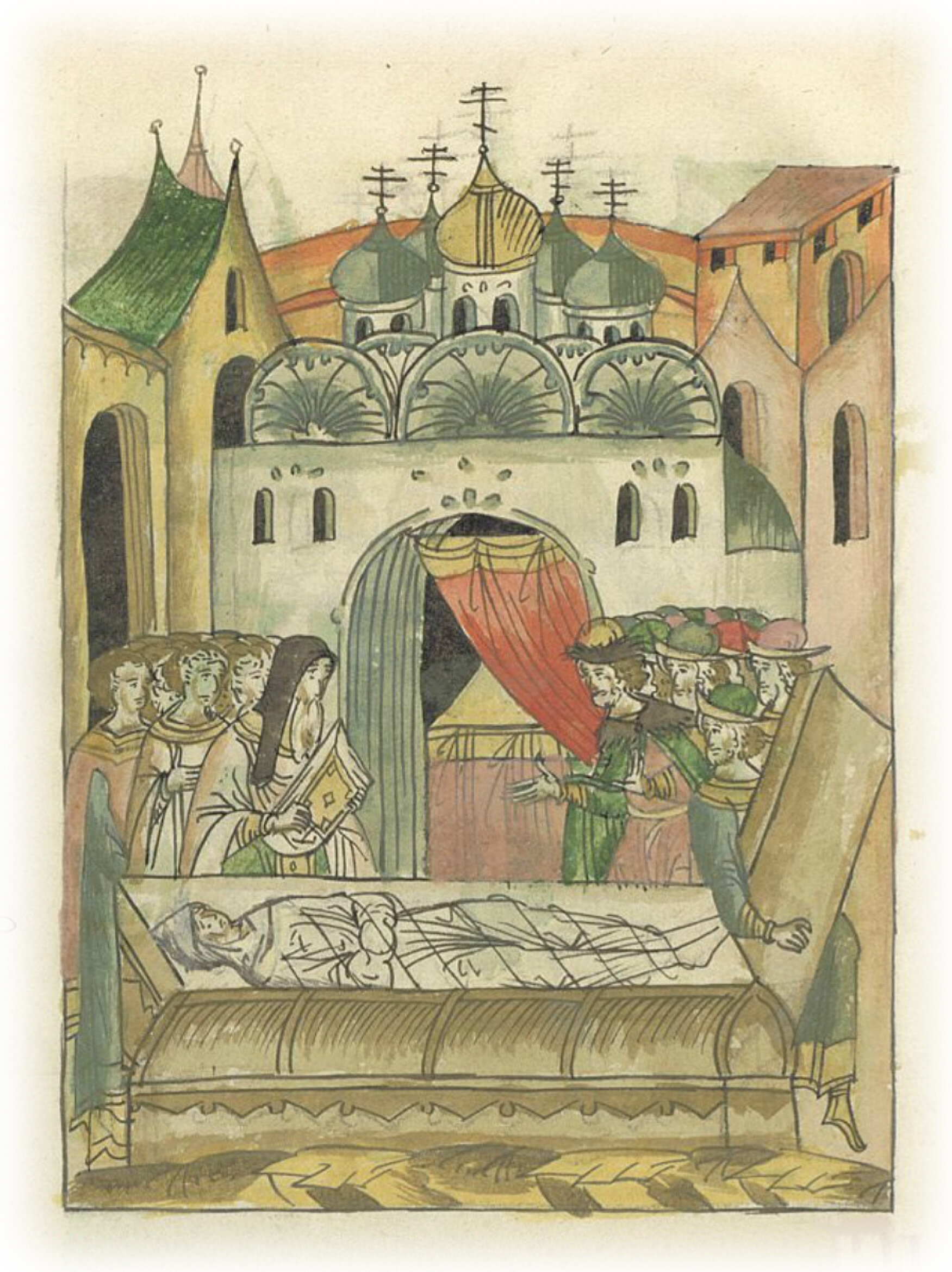 Похороны князя Дмитрия Юрьевича Красного. Гроб с телом князя кладут возле гроба его отца князя Юрия Дмитриевича.