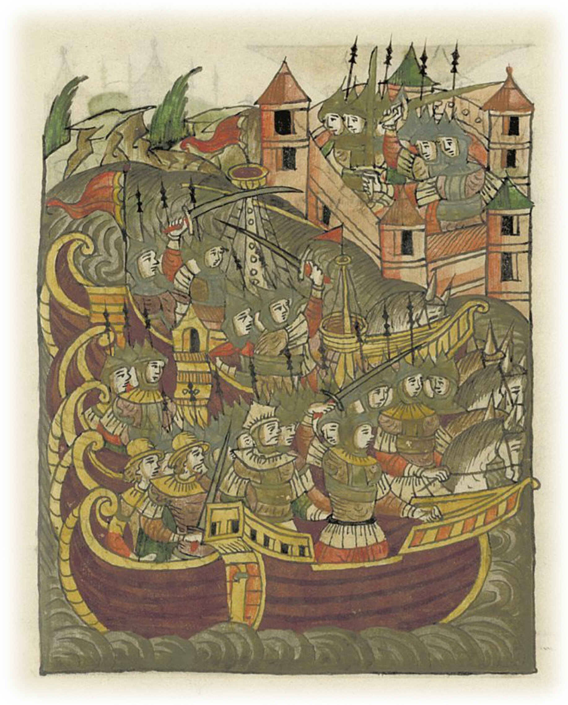 И подошли на 40 больших кораблях, были же плоты (?) между ними, в которых находились люди на конях, сами люди и их кони были закованы в броню, и некоторые стояли сзади в кораблях и в галеях*, опасаясь воспламенения, так как еще раньше греки пустили 10 кораблей с огнем против латинян, но изменился ветер в полночь на Васильев день, и не успели ничего причинить кораблям латинян; так как наставил их раньше Исаакович. * тип судна.