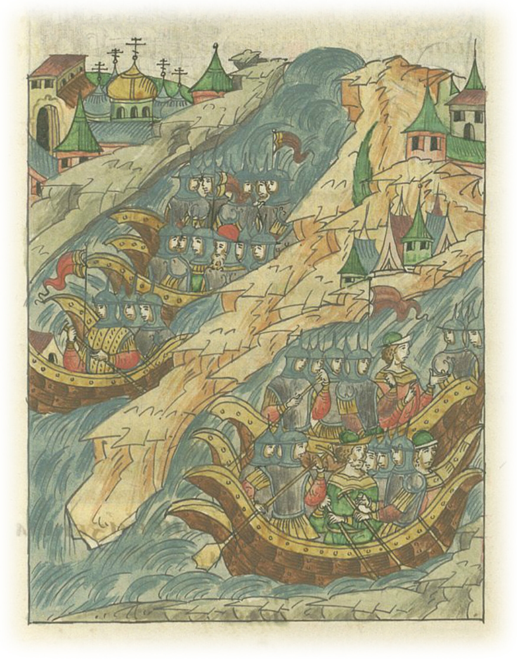 В том же году новгородский посадник Анфал ходил с войском против болгар по Каме и Волге, по реке Каме прошло сто насадов*, а по реке Волге – полтораста насадов, камские насады пришли раньше, а волжские не успели подойти. * лодки.