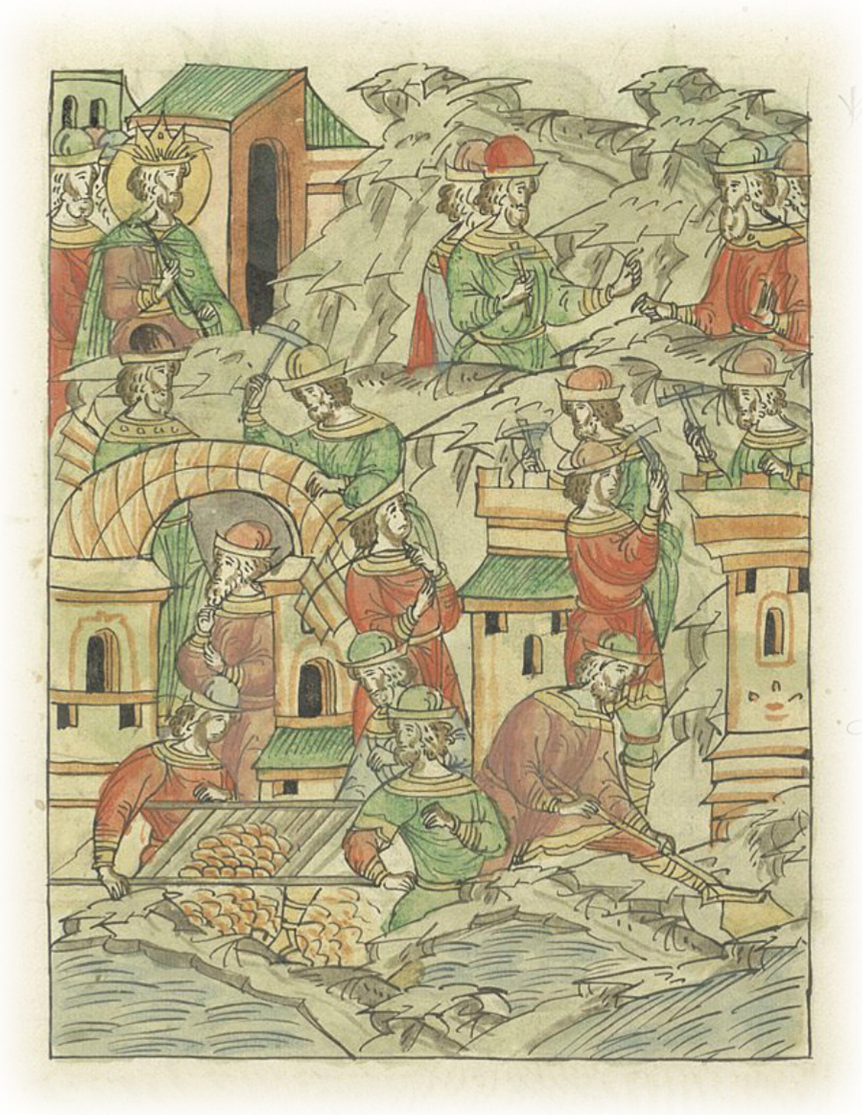 И, придя в Византию, увидел на том месте семь гор и множество морских заливов. И повелел рыть горы и засыпать нижние места, а в заливах столпы каменные воздвигать, и на них своды ставить, и ровнять место; и сам царь пребывал в Византии.