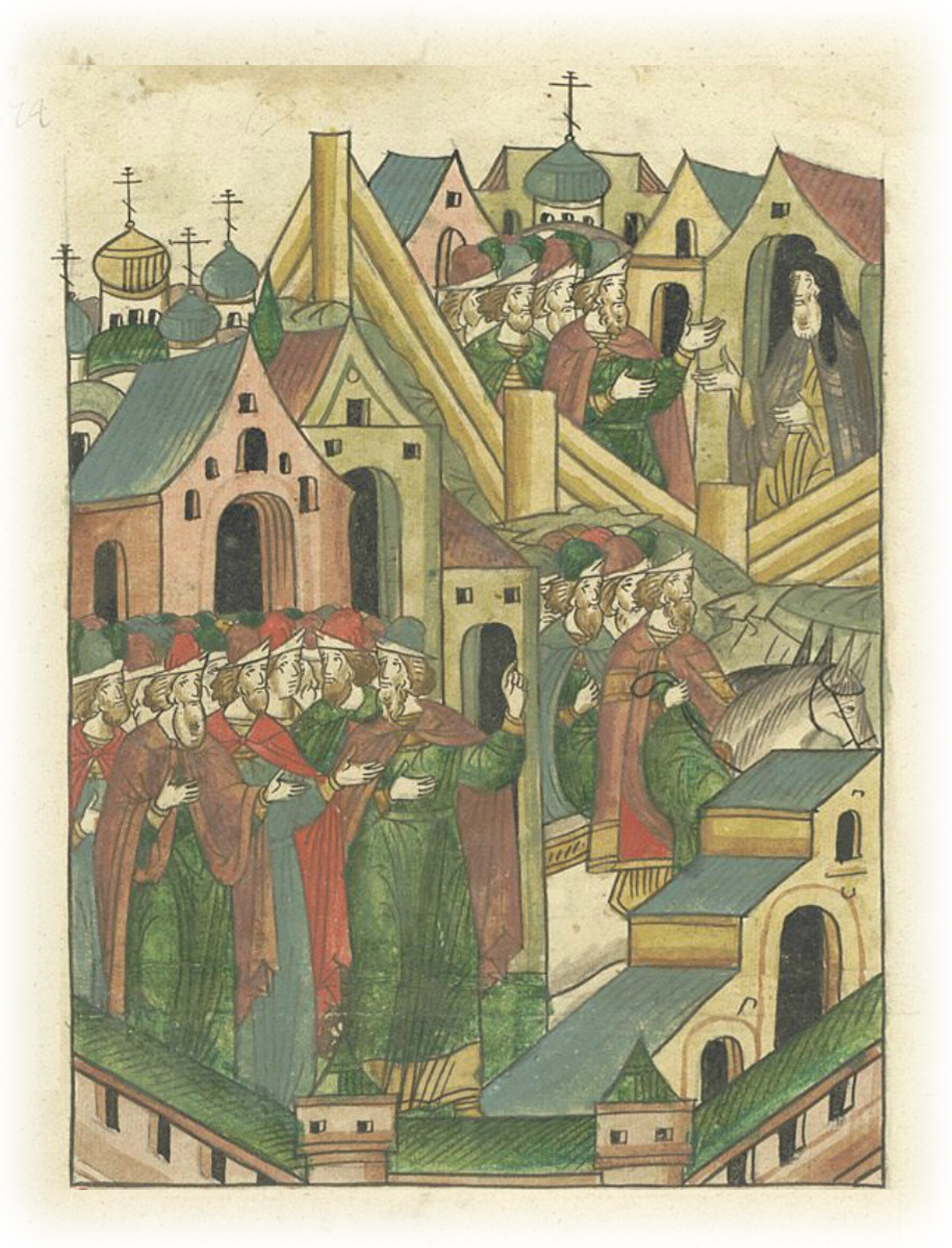 И послали к владыке с челобитьем наместника великого князя Ивана Прокофьевича, посадника Юрия Онсифоровича и тысяцкого Алексия вместе со многими боярами и знатными людьми.