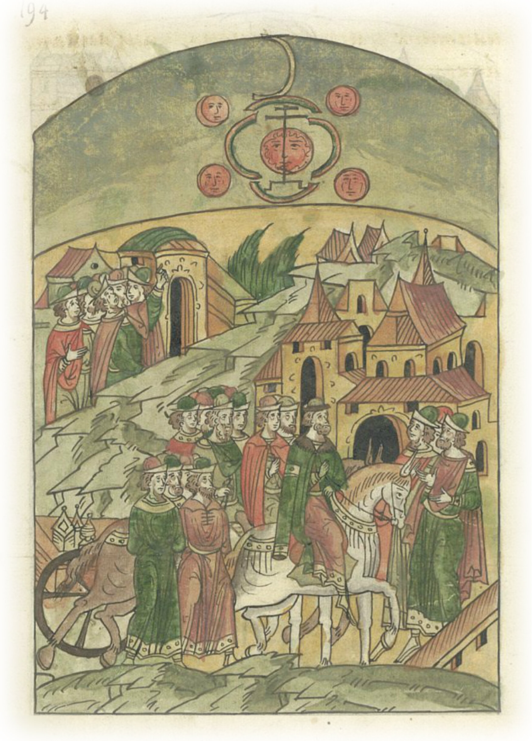 Той же зимой в месяце феврале было знамение в солнце: оградилось дугами, а посреди дуг - крест, и вне дуг четыре солнца, а на верху солнца дуга великая, на север рогами. В том же году князь Глеб Василькович Ростовский пришел из Орды от царя Менгу-Темира, побывав с ним на войне, и с сыном своим Михаилом, и с племянником своим Константином Борисовичем, внуком Васильковым, и привели с собою множество полона, и богатство, и в чести великой были у царя.