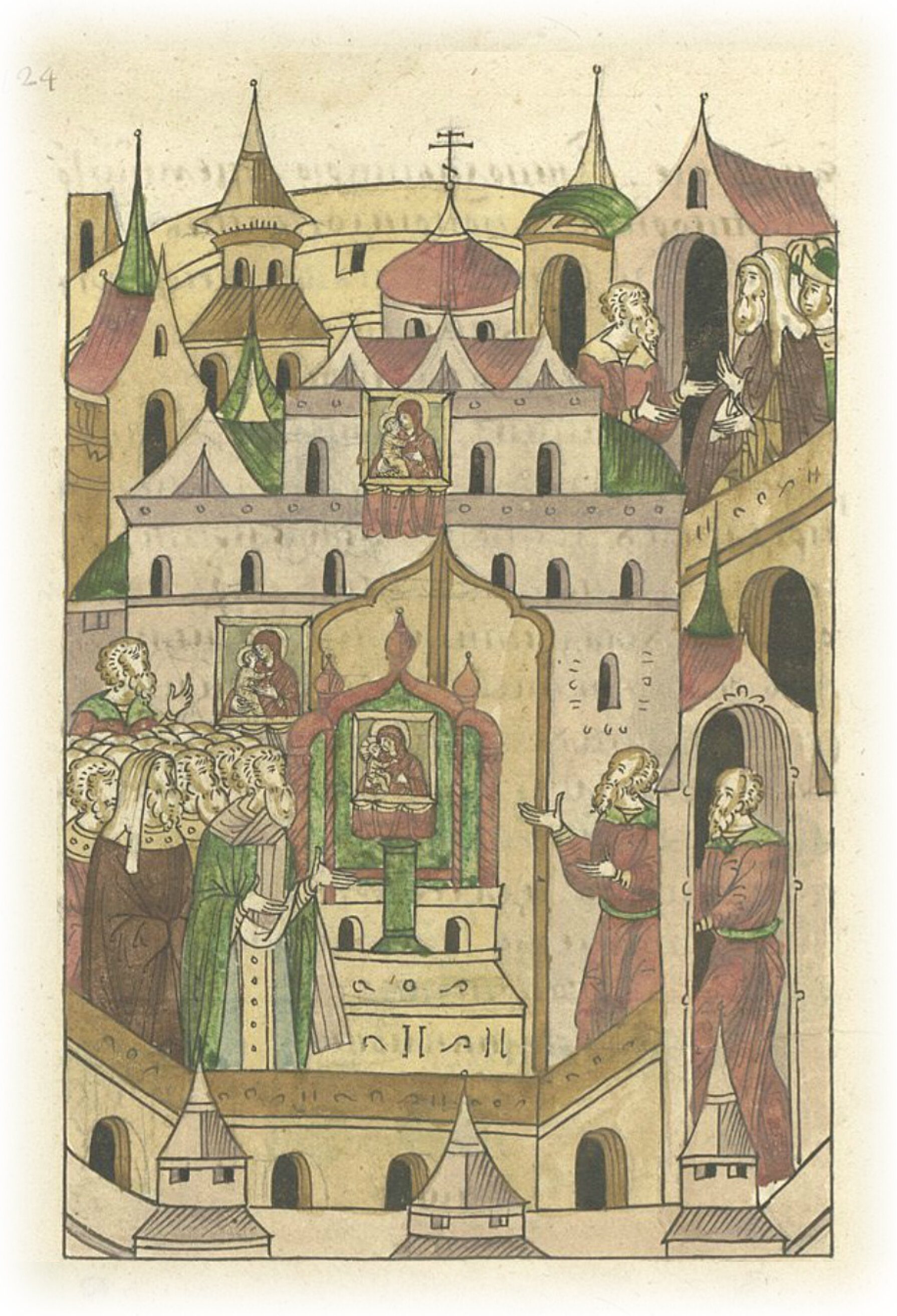 8 июля явилось знамение в Новгороде, в церкви святой Троицы на Рядитиной улице: сторож услышал, как что-то в церкви стукнуло, он вошел в церковь, чтобы посмотреть, что случилось? А это – икона святой Богородицы, держащей Сына на руке, стоит над дверями с северной стороны, во втором поясе. И икона в тот же час в полдень сошла с высоты и встала поодаль, ничем не поддерживаемая, и слезы текли из очей ее. О, великое чудо, как из сухого дерева слезам быть! Но это, видимо, Бог прославлял Свою матерь, молитву Ее приемля, спасая град. И в тот же час призвал владыку Василия, и сотворили киот, и поставили в киоте икону ту, и сотворили праздник на память святого мученика Прокопия.