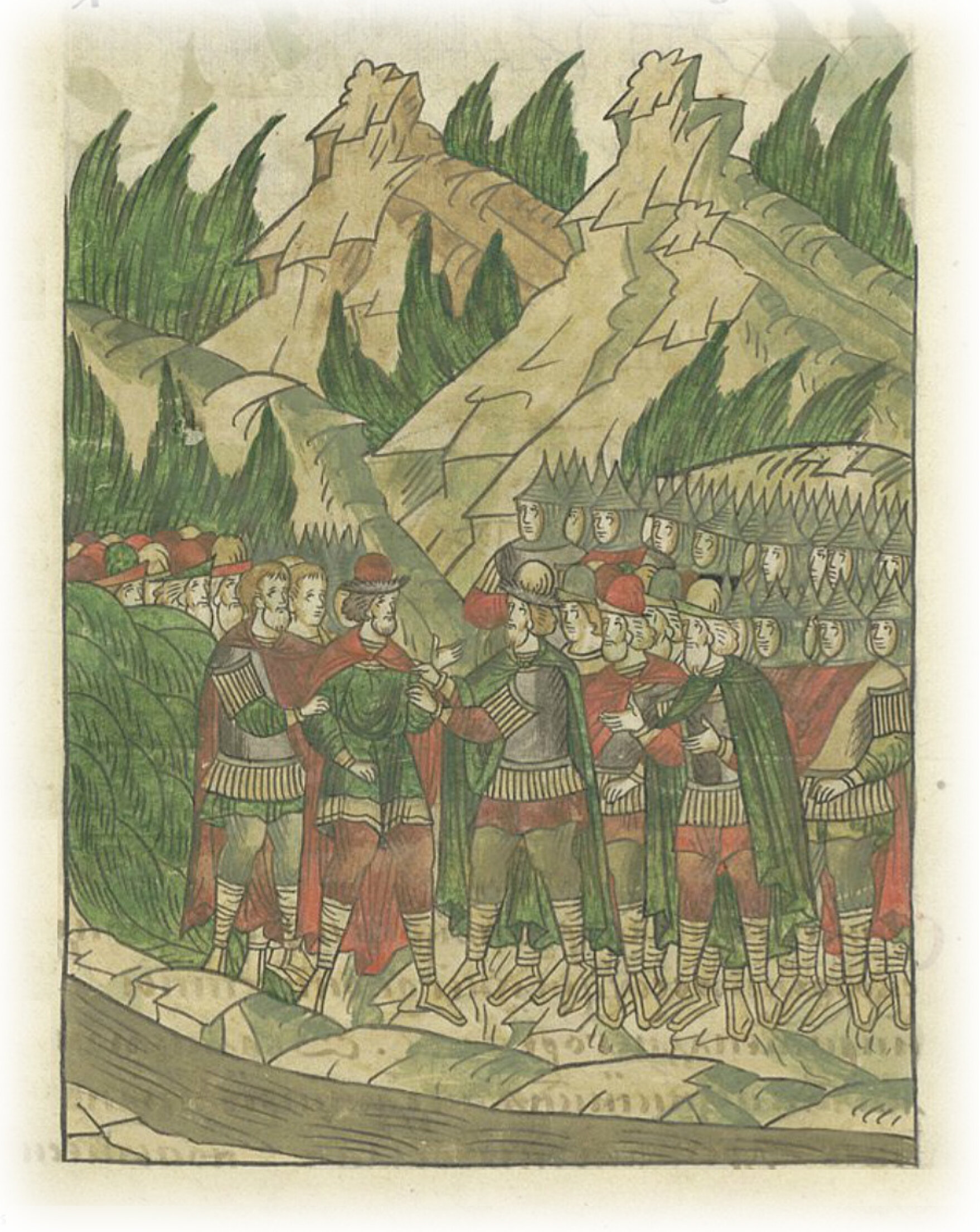 Языки говорят воеводам царя Ивана Васильевича, что магистр окопался большим рвом вокруг города Рындола, бьет из пушек и пищалей и приступает к Рындолу.