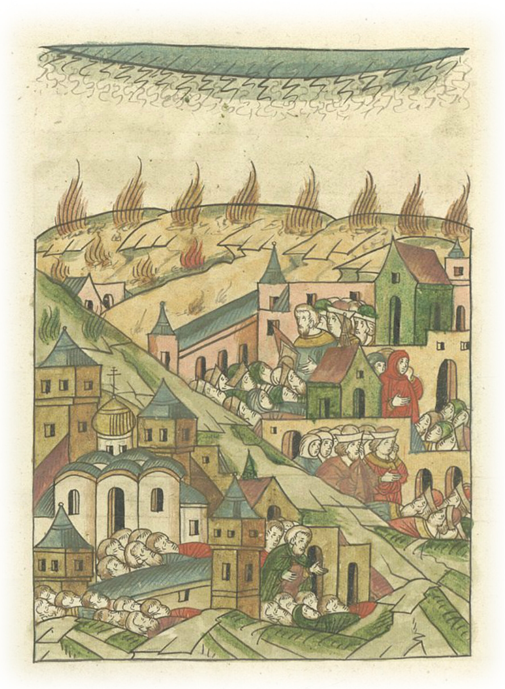 В том же году сильный мор был на Волоке. В том же году сильный мор был и в Литве. В том же году была засуха и сильный зной, воздух стал непрозрачным, и земля горела, повсюду подорожал хлеб, и голод наступил по всей земле, и от этого умирали люди.