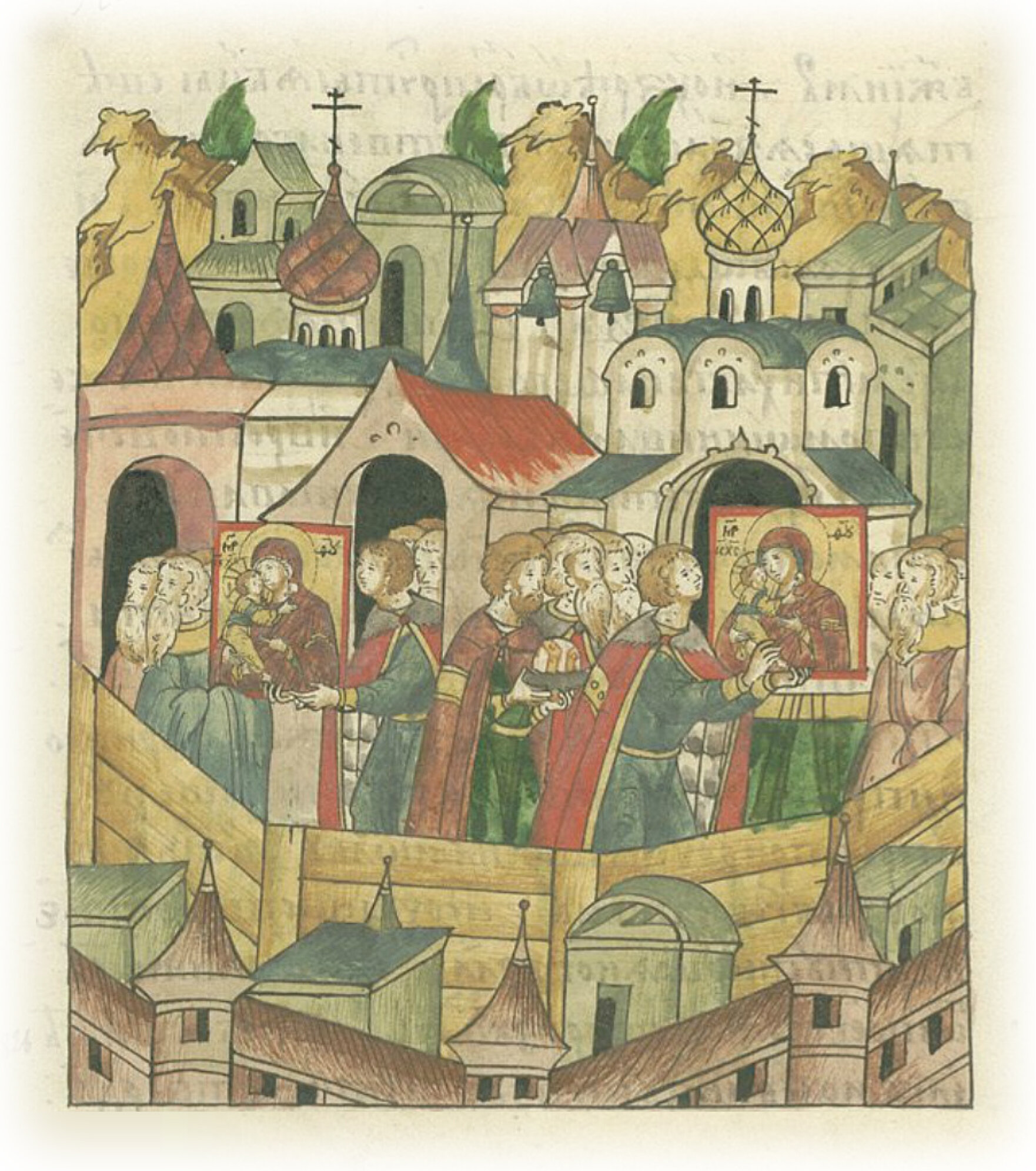 О шествии из Вышгорода с иконой Богоматери. Долго молился великий князь Андрей, и, закончив молебен, подошел к иконе пречистой Богородицы, простер руки свои, прикоснулся к чудотворному тому образу Богоматери, и взяв его, как бесценное сокровище, вышел из церкви, не предупредив об этом отца своего великого князя Георгия, послушав льстивый совет окаянных Кучковичей.