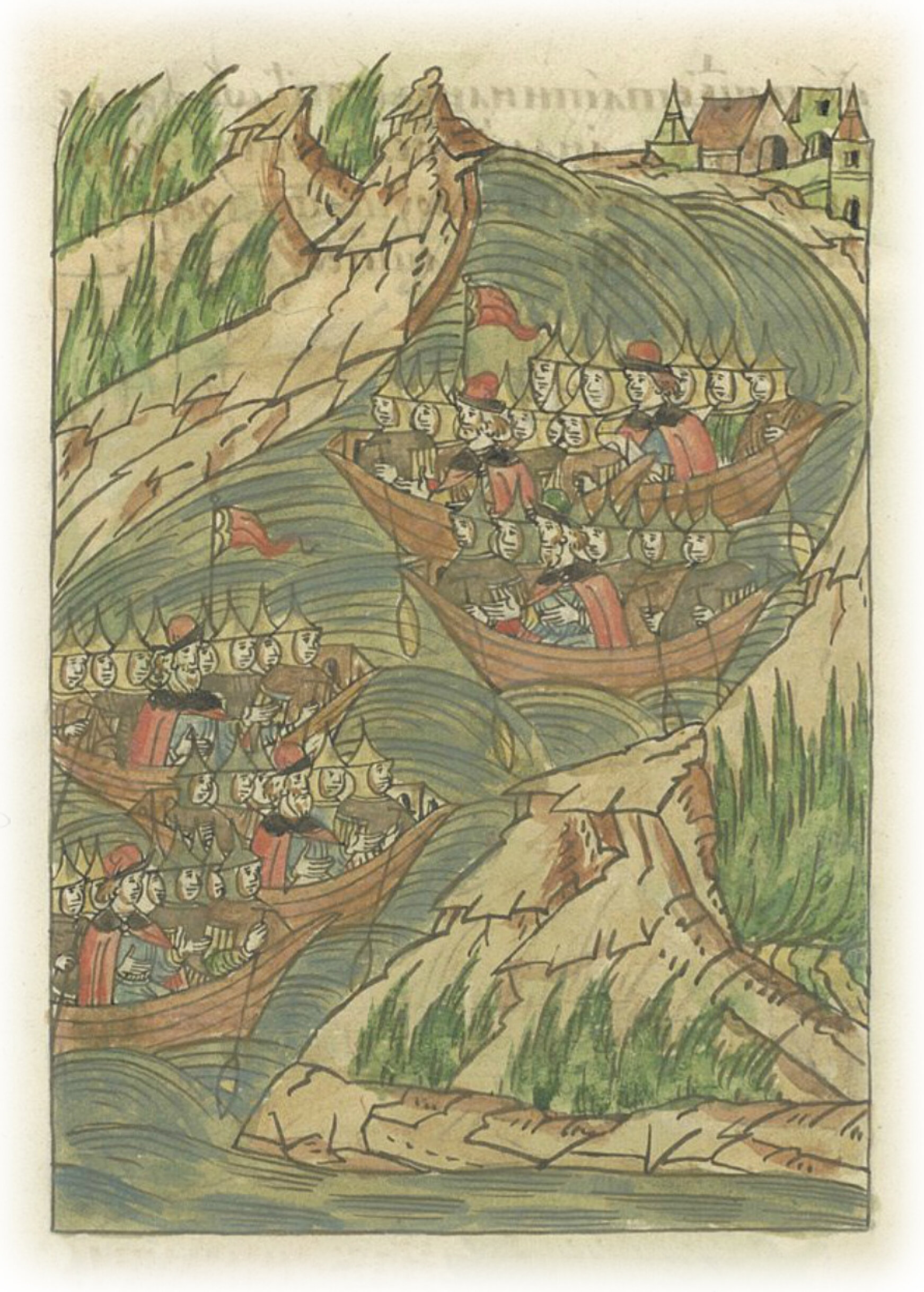 А судовая рать татарская, лучшие князья и люди пошли на рать великого князя, на судовую же, желая уничтожить их, ибо немного их осталось. Они же, не боясь, пошли против татар, хотя и много тех было,