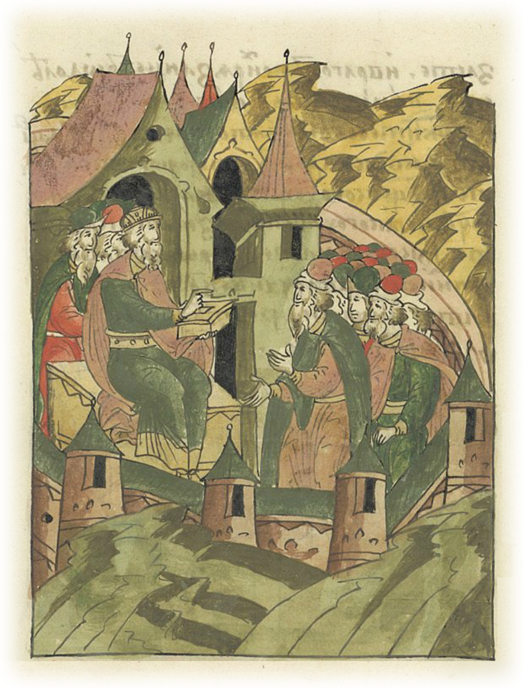 Ругодивские посадники Яким и Захар приезжают в Москву. Воеводы царя Ивана Васильевича Алексей Адашев и Иван Михайлов сообщают им, что государь пожалует их, если сдадут его воеводам помимо Ругодива Вышгород.