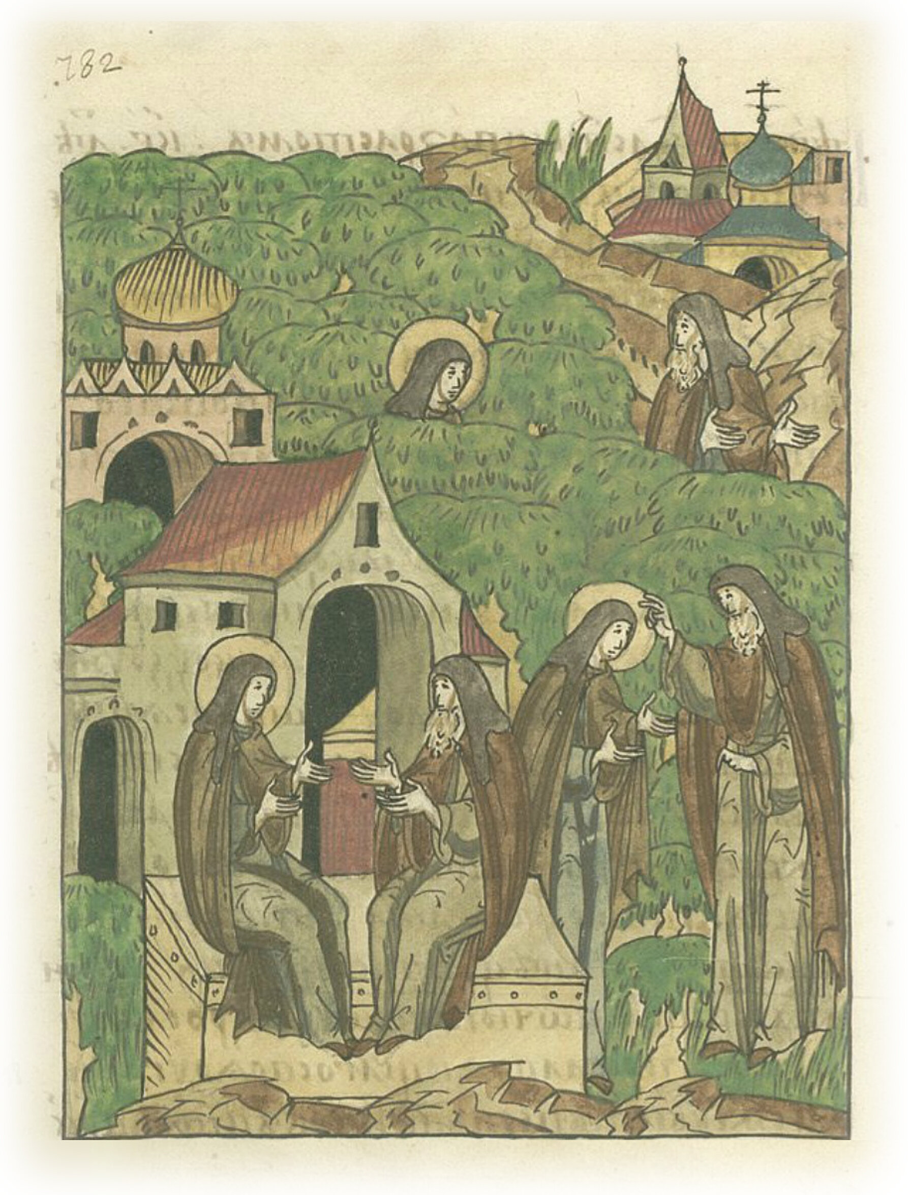Повесть о преподобном Сергии Радонежском. Игумен Митрофан, пожив некоторое время с новопостриженным Сергием и поучая его, уходит обратно.