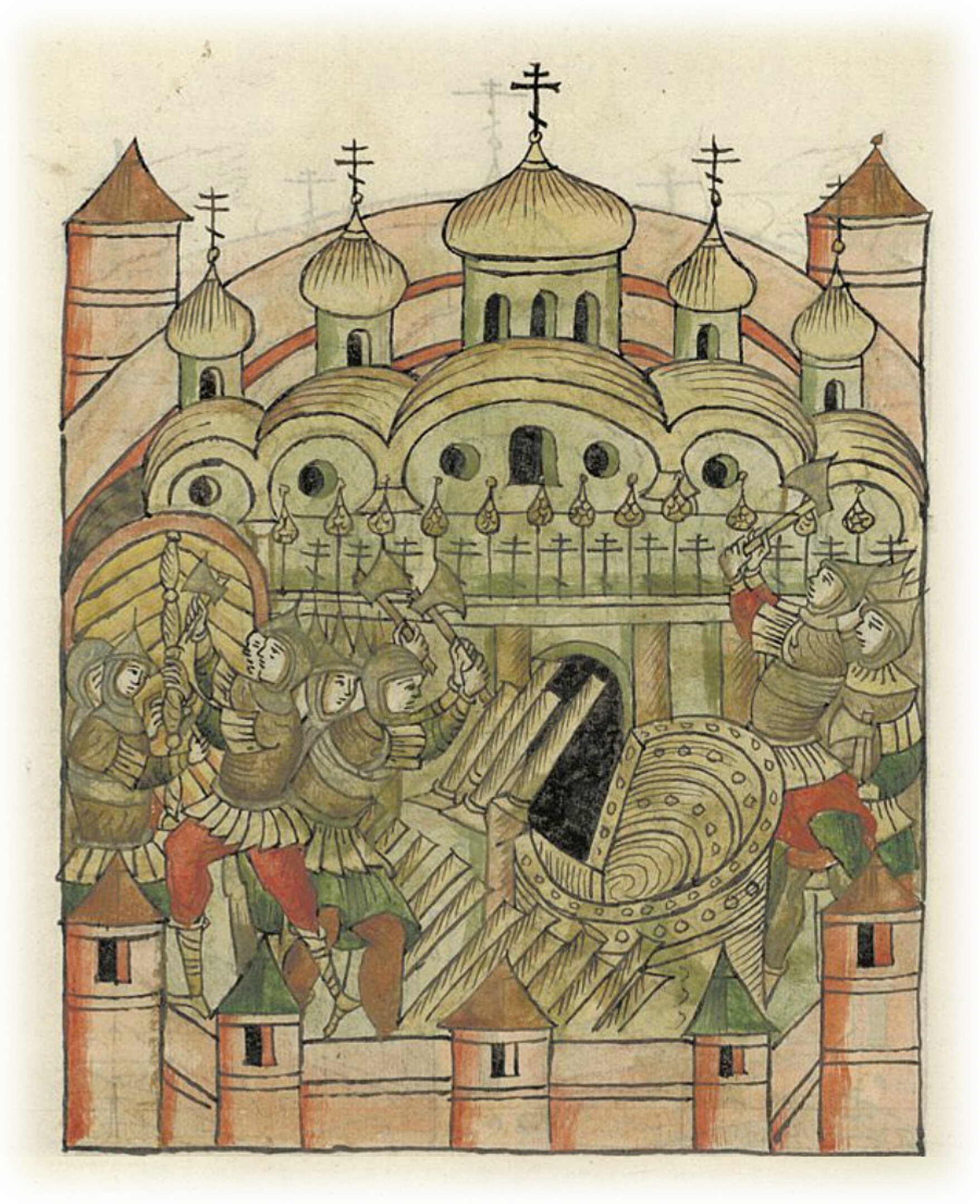 И на восходе солнца вошли в святую Софию, и выломали двери, рассекли амвон, весь окованный серебром и имевший 12 серебряных столпов и 4 киотных, и тябло посекли, и 12 крестов, которые были над алтарем, и шишки, находящиеся между ними, как деревья, размером выше человеческого роста, и алтарные перегородки между столпами, все то было сделано из серебра;