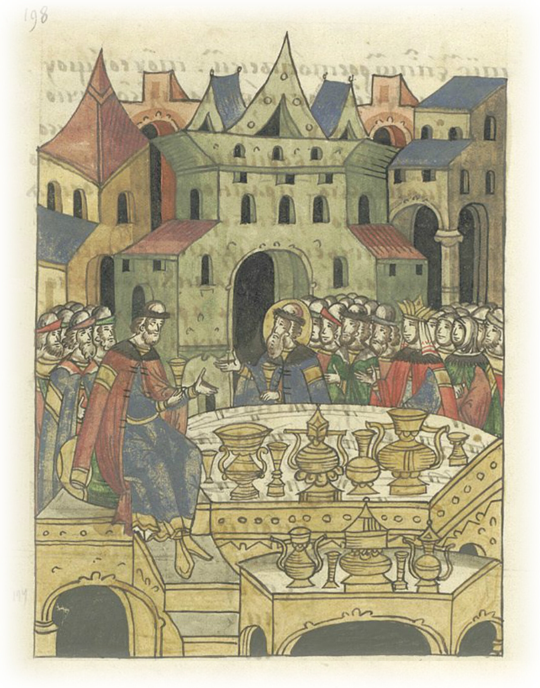 Князь же великий Глеб Василькович, внук Константинов, правнук Всеволодов, сотворил пир великий у себя в Ярославле и почтил свата своего, Федора Ростиславича Черного, и княгиню его, и с детьми его, и зятя его, Давыда Константиновича Галичского и Дмитровского, и бояр его, и слуг его.