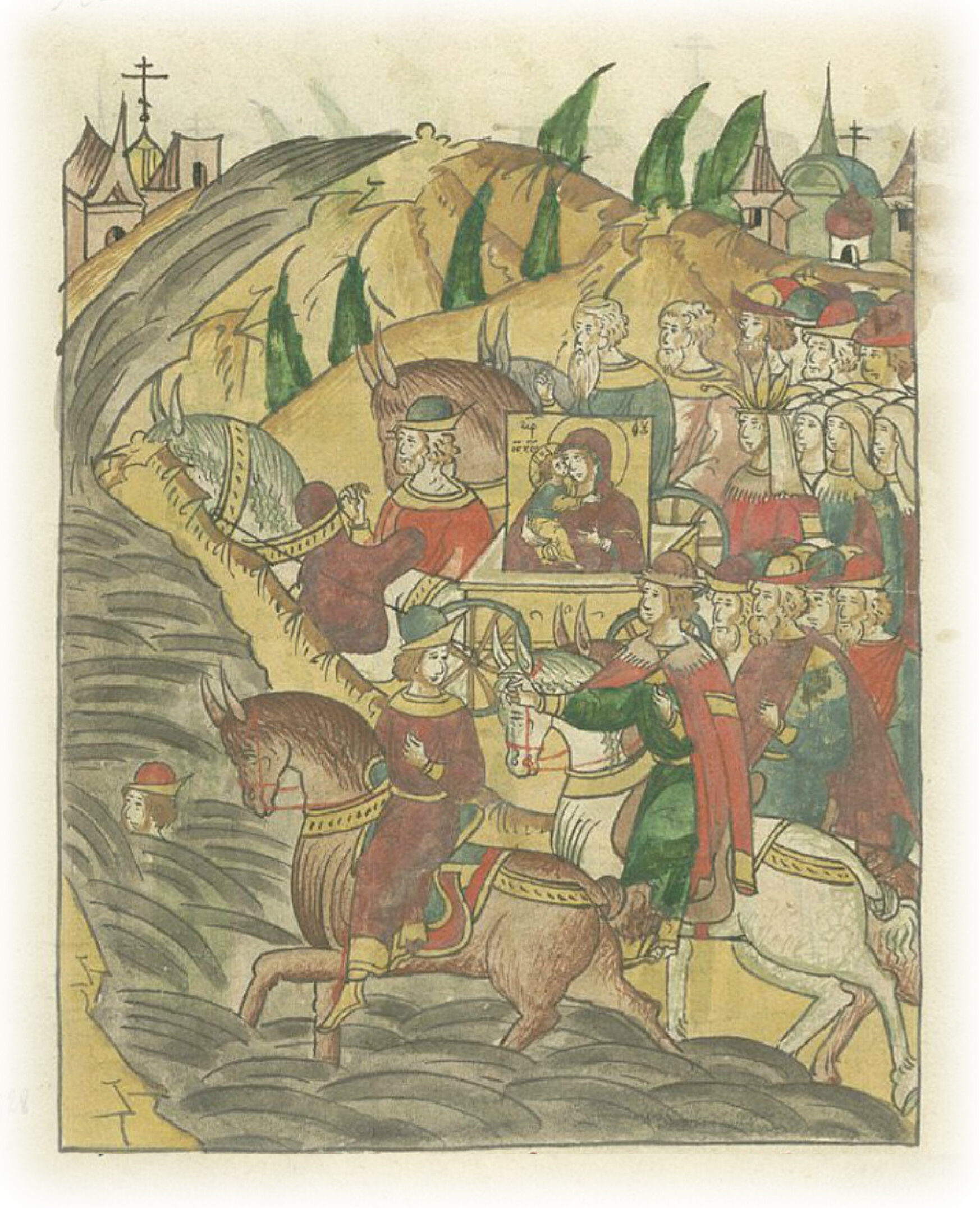 О чудесах от иконы Богоматери. От святой иконы Богоматери много совершалось чудес тогда и потом. О них будет особое сказание. Здесь же расскажем вкратце. Когда пришли к реке Вузе, в ней высоко поднялась вода. И великий князь послал поискать брод. Пошел человек, погрузился на дно реки и долго не появлялся.