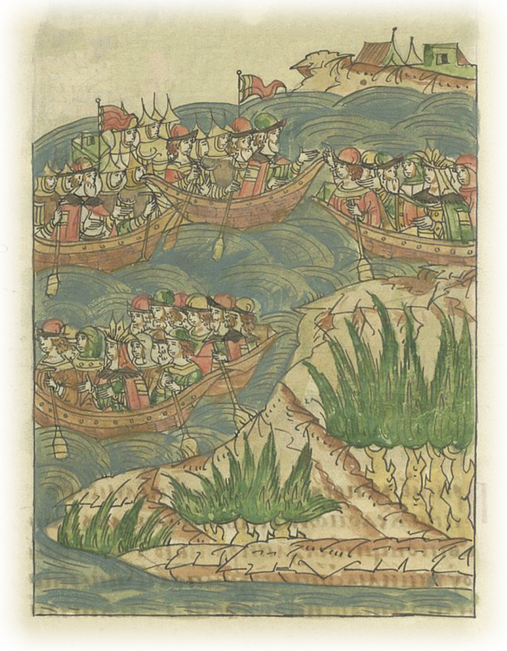 И пошел Константин со всеми воинами с Ирихова острова к Нижнему Новгороду вверх; они гребли тот день и наутро до половины дня, и тут встретила их царица Касымова, Казанского царя Обреима мать, и начала говорить воеводам великого князя: «Если великий князь отпустил меня к моему сыну со всем добром и с честию, значит, не будет никакого лиха между ними, но все будет по-доброму». И она поплыла мимо них, а они вверх пошли.
