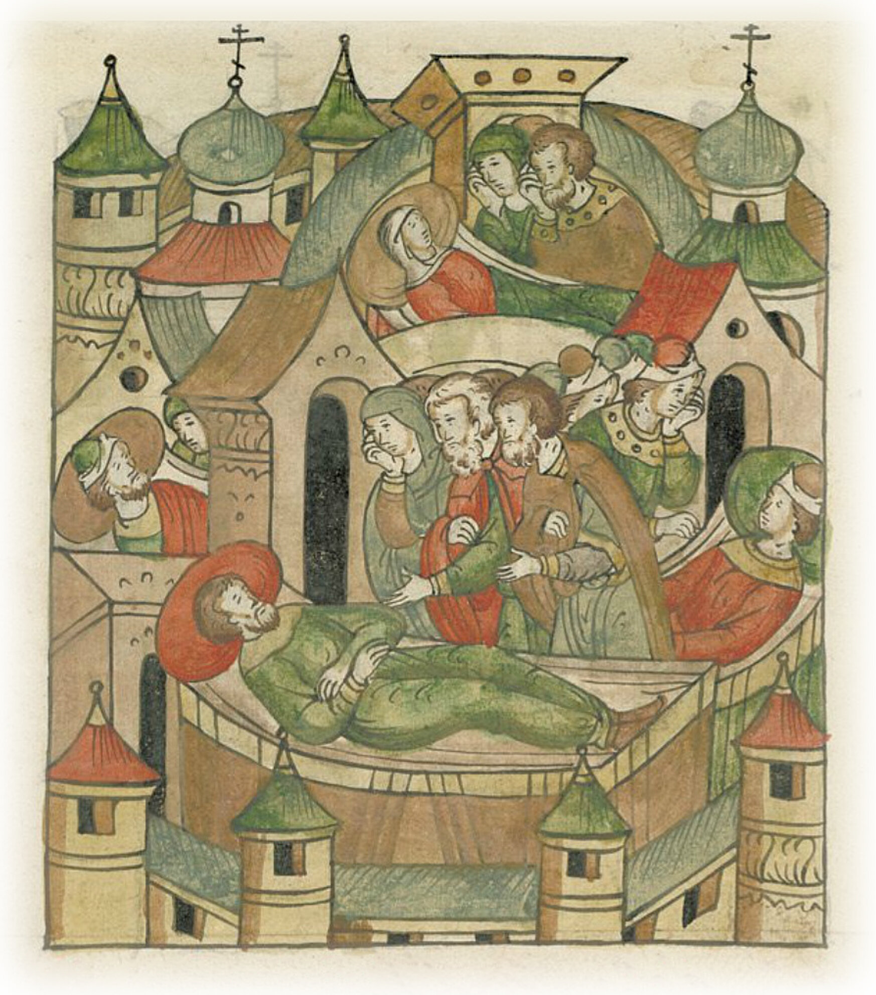 О море в Великом Новгороде и о поставлении и об освящении церкви святого Марка. Той же осенью в октябре случилось в Великом Новгороде такое: начала появляться у людей болезнь, начиналось все с прыща, и от этого начало множество людей умирать, и было поветрие немалое.