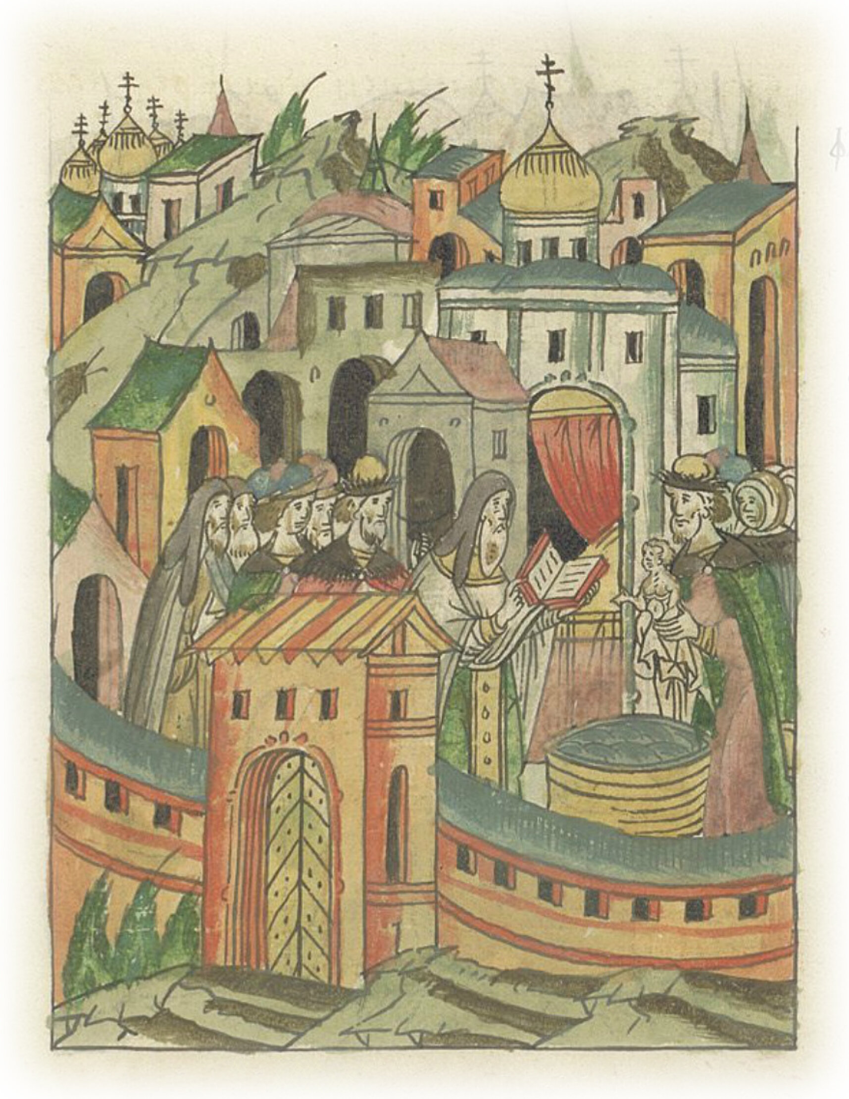 Игумен Троице-Сергиева монастыря Зиновий крестит новорожденного князя Ивана Васильевича.