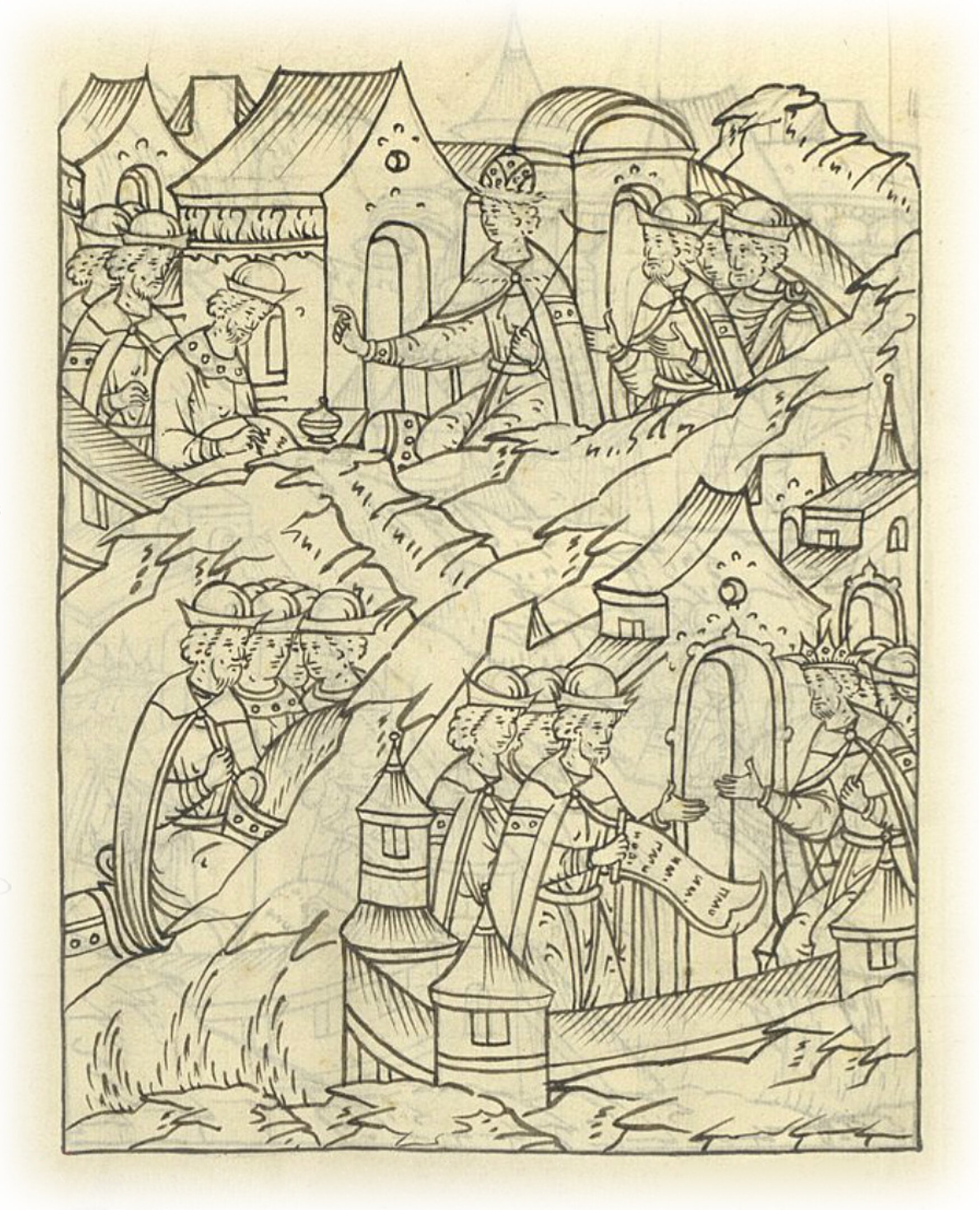 Языки говорят воеводам царя Ивана Васильевича, что магистр окопался большим рвом вокруг города Рындола, бьет из пушек и пищалей и приступает к Рындолу.