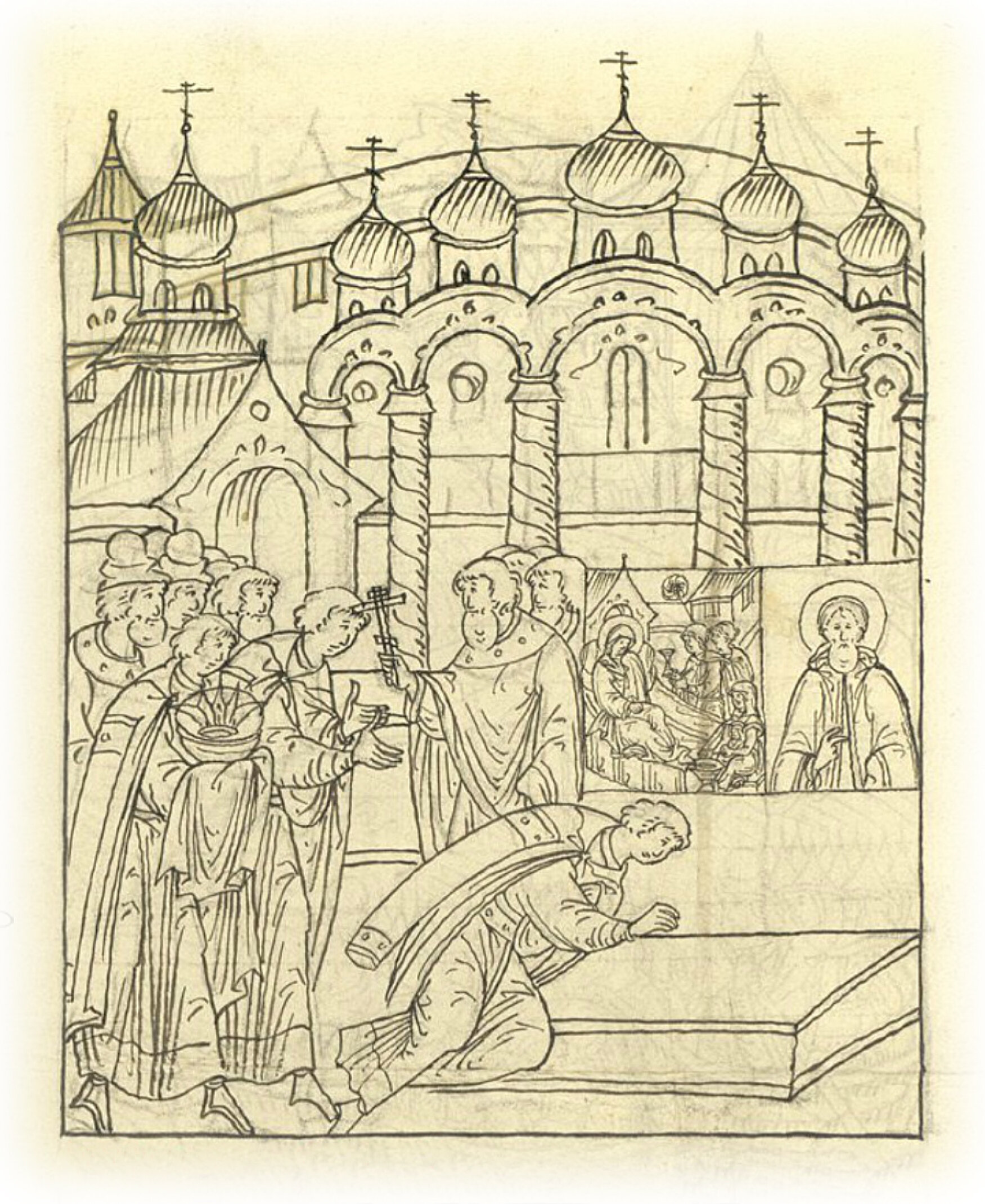 18 августа в четверг пришел государь в соборную церковь Рожества Пречистой и, пев молебен, припадает к иконе Пречистой и к чудотворному образу Сергия чудотворца, со многими слезами молясь много времени, тайно молитвы воссылая, Богу одному известные, и благословляется у протопопа и у всего священнического чина, который там пребывал.