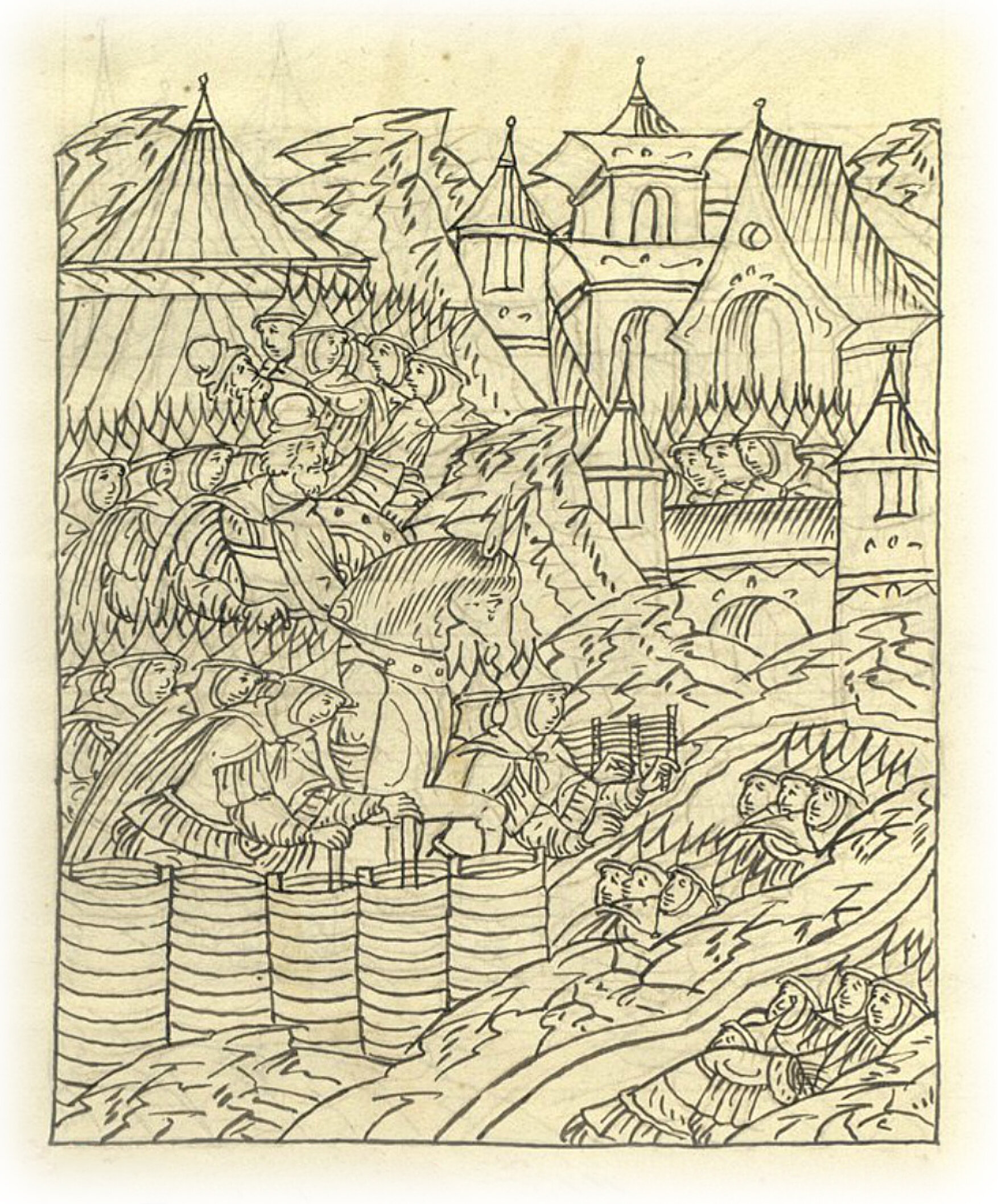 Языки говорят воеводам царя Ивана Васильевича, что магистр окопался большим рвом вокруг города Рындола, бьет из пушек и пищалей и приступает к Рындолу.