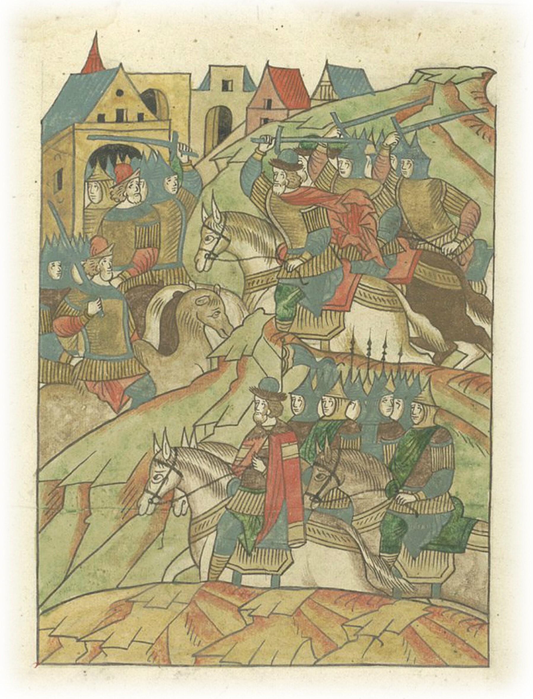 а некоторые выехали на верблюдах, кони же русских всадников испугались верблюдов. Но помог Бог русским князьям, и они загнали их обратно в город.