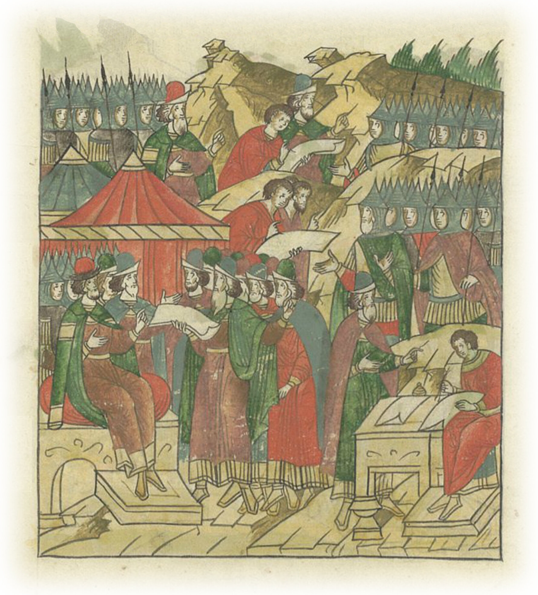Ругодивские посадники Яким и Захар приезжают в Москву. Воеводы царя Ивана Васильевича Алексей Адашев и Иван Михайлов сообщают им, что государь пожалует их, если сдадут его воеводам помимо Ругодива Вышгород.