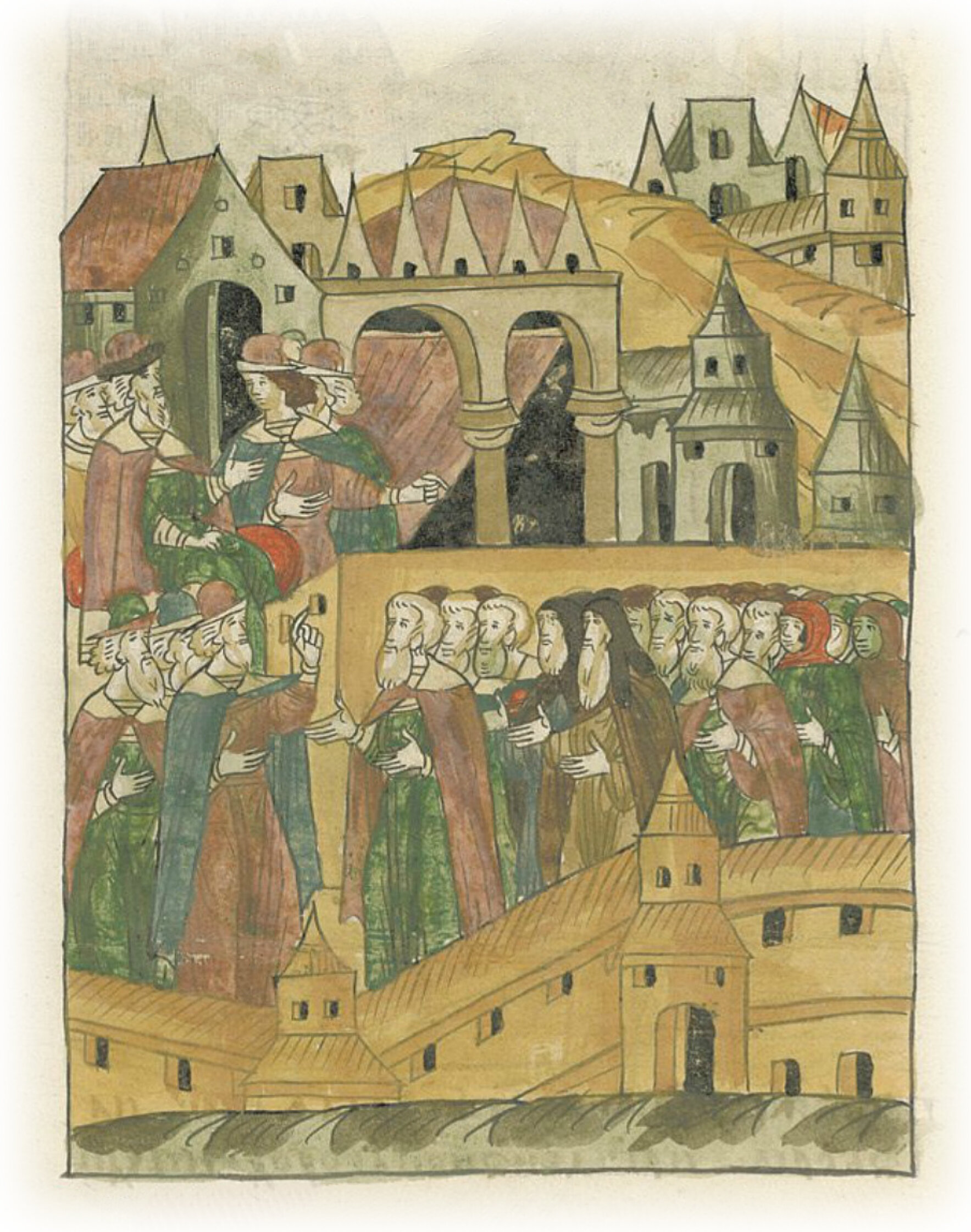 Новгородские посадники, зажиточные горожане, поселяне, чернецы и вдовы приходят к великому князю Ивану Васильевичу искать ответ за обиды.