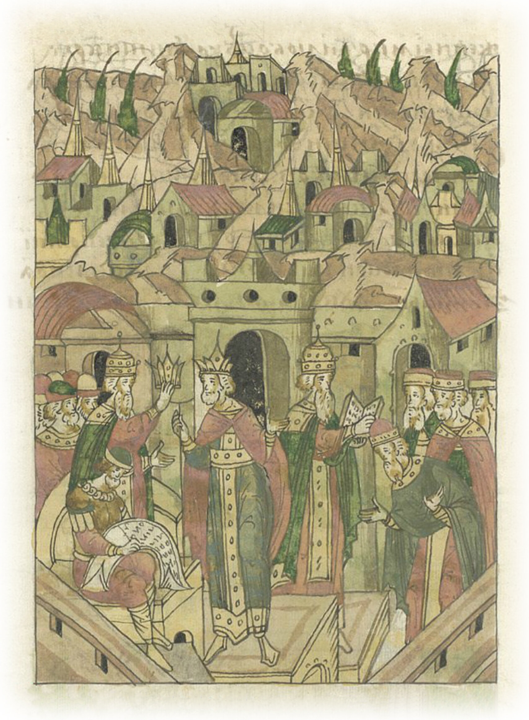 и поставил его царем; и написал закон, согласно которому папа в Риме избирается латинянами, а царь в Великой Британии избирается алманами вместо царя Константинопольского, то есть греческого Цареградского царя. Также и в большие города в римских государствах вместо четырех патриархов: Константинопольского, Александрийского, Антиохийского, Иерусалимского поставил своих четырех патриархов, которых называют кардиналами. И так совершенно удалился от благочестивой веры и греческого закона, христианского православия, и свои римские законы составил по своему закону и обычаю, и были они враждебны грекам, и свою злобу, вызывающую смуту, распространяли, не покоряясь Греческой державе и закону, и унаследовали проклятие, ослепленные своей гордыней.