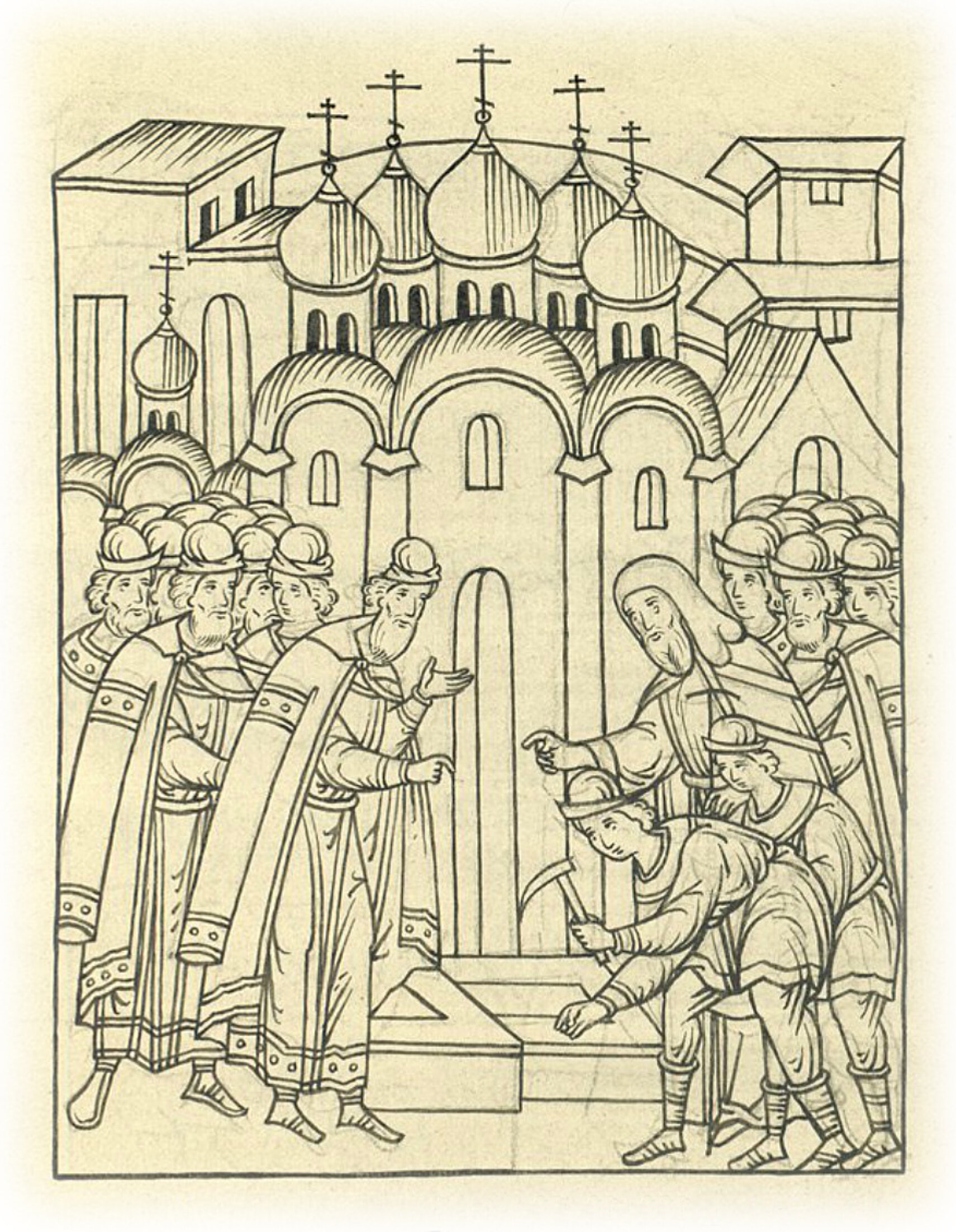 Боярин Михайло Юрьевич велит выкопать могилу для великого князя Василия Ивановича в Архангельском соборе рядом с могилой его отца, великого князя Ивана Васильевича.