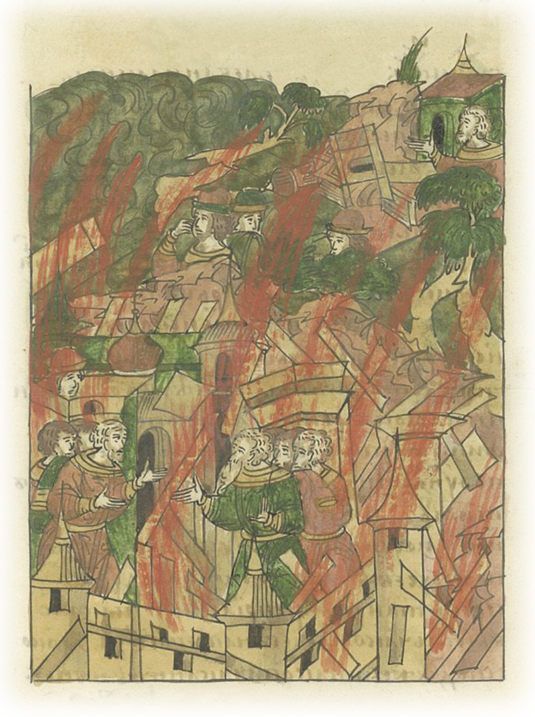 Наутро же, в 14 день, тишина была большая весь день; вечером же, уже в 15 часу, появилась туча грозная с юга в половину неба, со страшною бурею и сильным вихрем; молнии же были так велики, что земля и храмы все как в пламени были, и гром страшный и великий был. Сильная эта буря поколебала многие церкви, и многие каменные храмы в городе Москве ободрало и верхи смело; и верхнюю часть городских стен разметало и разнесло, а по селам и по волостям многие церкви из основания вырвало и далеко отнесло. Также и дома многие разорило, разметав. А леса старые и боры, и раменья*, и дубы великие с корнями вырвало. А у иных верхи сломало, другие же были сломаны до половины, иные же до трети, и некоторые под самый корень, особенно те, которые очень толсты были. Люди же все были в большой печали и в унынии, и не надеясь выжить, не знали, что делать на пользу себе, но только друг у друга прощение просили. Человеколюбие Господа нашего Исуса Христа таково, что нигде и никакого человека не повредило ни в городах, ни в селах, ни в пути, ни в поле, ни в лесах. Даже те, которые в храмах тех были, которые разметало или засыпало от деревьев тех, все его человеколюбием спасены были. Ибо это наказание было от Господа нашего Исуса Христа на нас грешных, чтобы отошли от зол наших и научились бы творить волю Его. И в тот же час прекратилась буря эта, и громы, и блистания молний, и наступила тишина, как и прежде. * лесная поросль на болотах; смешанные или хвойные леса.