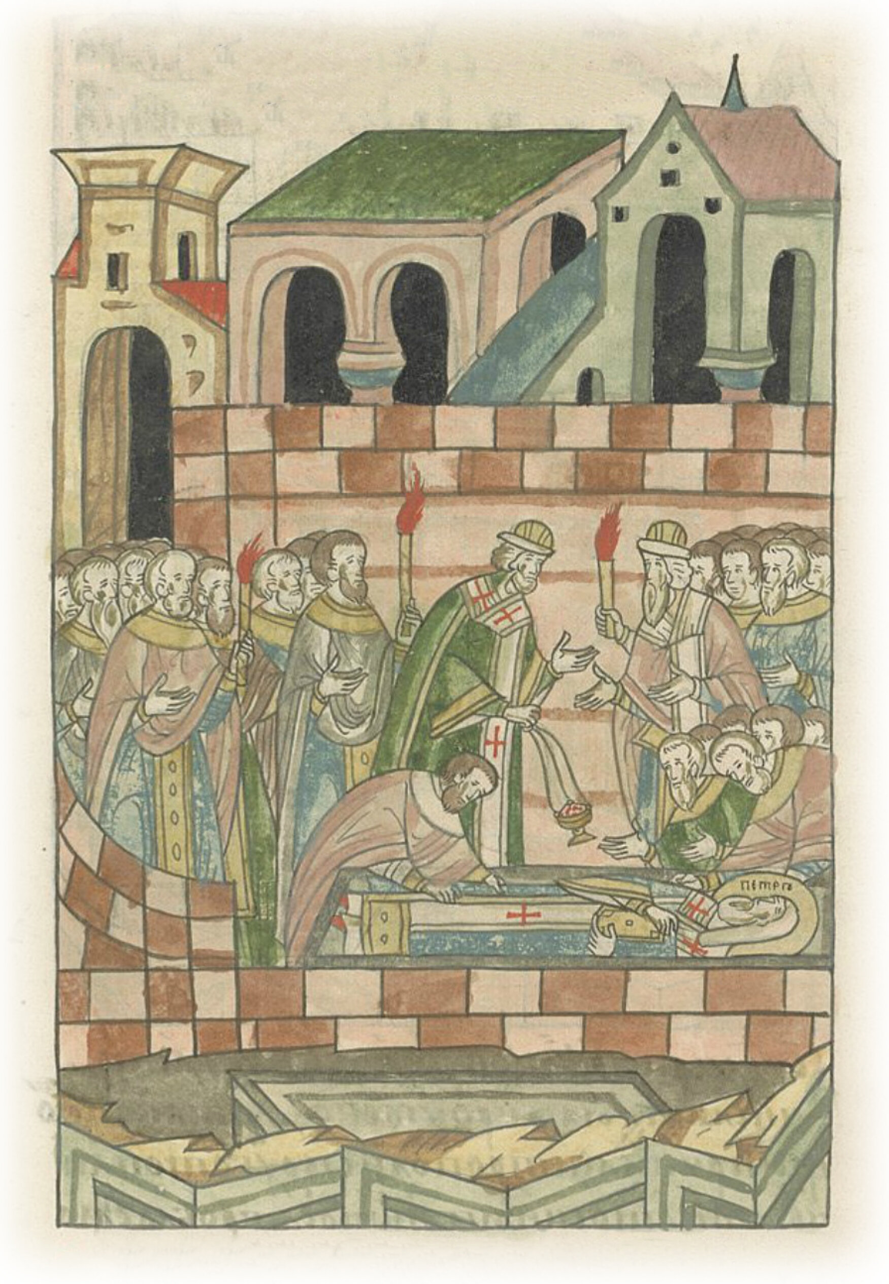 Со страхом же многим и с радостью взял мощи его из той раки и в новую каменную вложил, и близ того же места поставил.