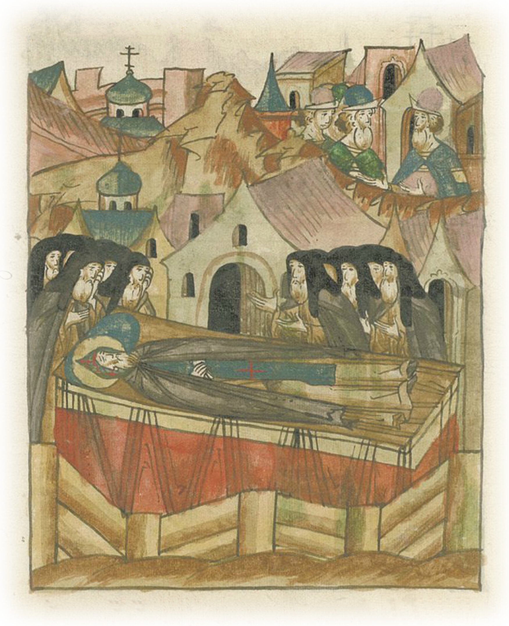 Кончина игумена Пафнутия Боровского. В том же году месяца мая в 1 день в четверг, после вечерни в 15 часов дня скончался преподобный игумен честной обители Рождества пресвятой Богородицы на реке Протве, близ города Боровска за две версты; сам же и поставил обитель ту, придя из монастыря Высокого из Боровска, где прежде игуменил при князе тамошнем Василии Ярославиче.