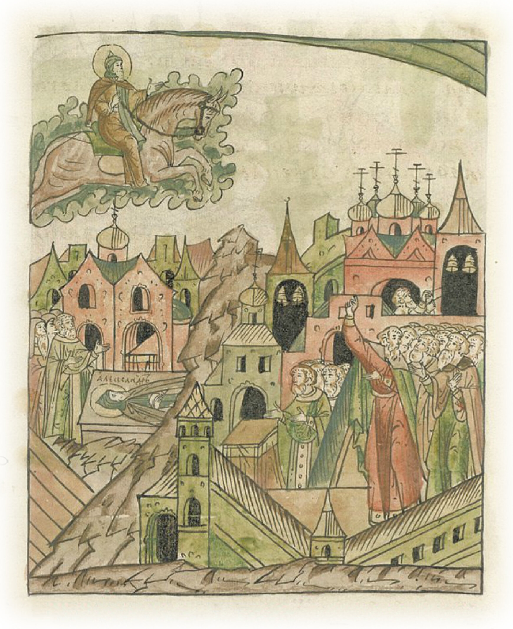 О явлении на воздухе святого и великого князя Александра Невского и о пожаре Владимирском. В 6999 (1491) году в преименитом городе Владимире было ужасное видение и страшное явление, и грозное знамение гнева Божьего, при помощи которого Бог, наказывая нас, приводит от греха на покаяние. Как говорят некие (люди), некогда в один из дней после божественной литургии видели многие над каменной церковью Рождества Пречистой Богородицы славной обители честного архимандритства, где лежат чудесные мощи блаженного великого князя Александра Ярославича Невского, в иноках же Алексия, на самом верху той церкви необычное видение, подобное легкому протянувшемуся облаку или струящемуся тонкому дыму, чистому, как иней, светлому и блестящему, подобно солнцу, и тогда в тонкости и светлости того облака увидели подобие образа блаженного и великого князя Александра, поднимающегося на коне вверх к небесам. Люди же, видевшие это, были охвачены великим страхом и ужасом и начали по всему городу звонить.