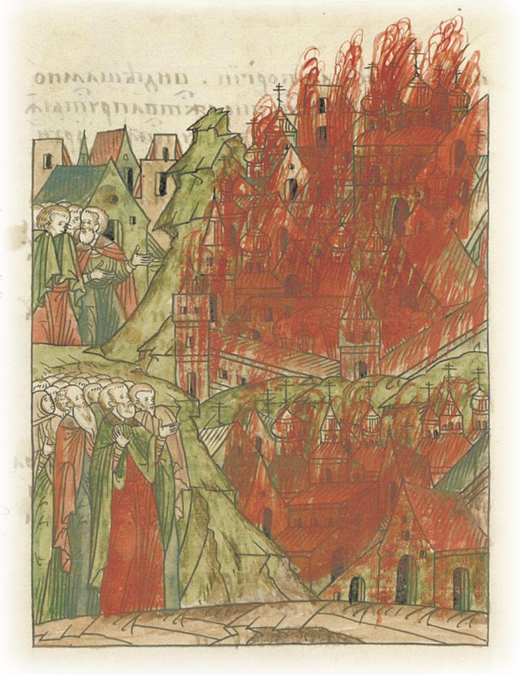 О пожаре. И в полдень того же дня начался великий пожар (месяца) мая в 23 день в понедельник, так что весь город Владимир со всеми домами и посадами сгорел; в городе 9 церквей, а на посаде 13 церквей сгорели; и многие беды тогда были городским людям христианам.