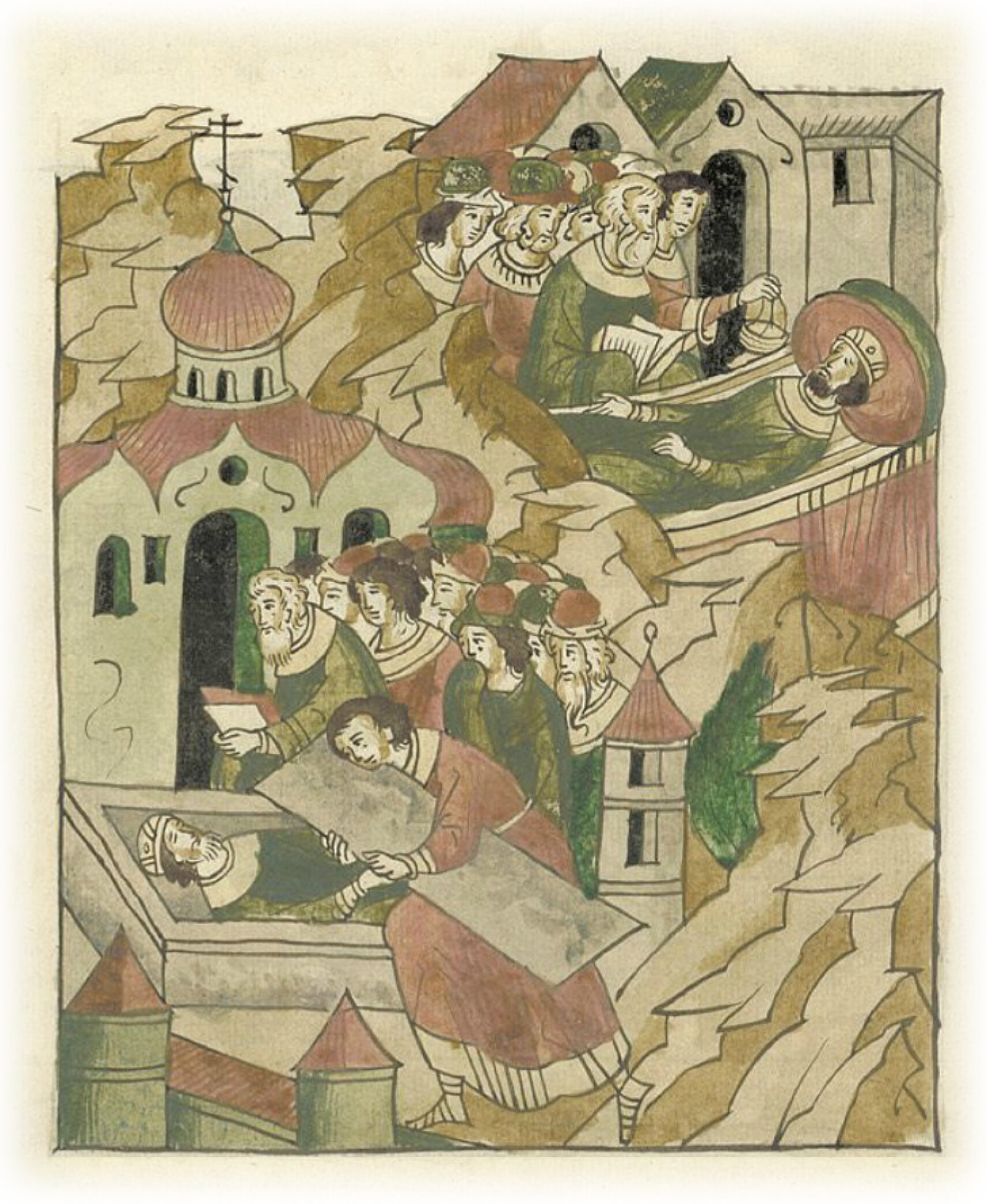 Кончина князя Святослава Юрьевича и его похороны в церкви Пресвятой Богородицы в Суздале.