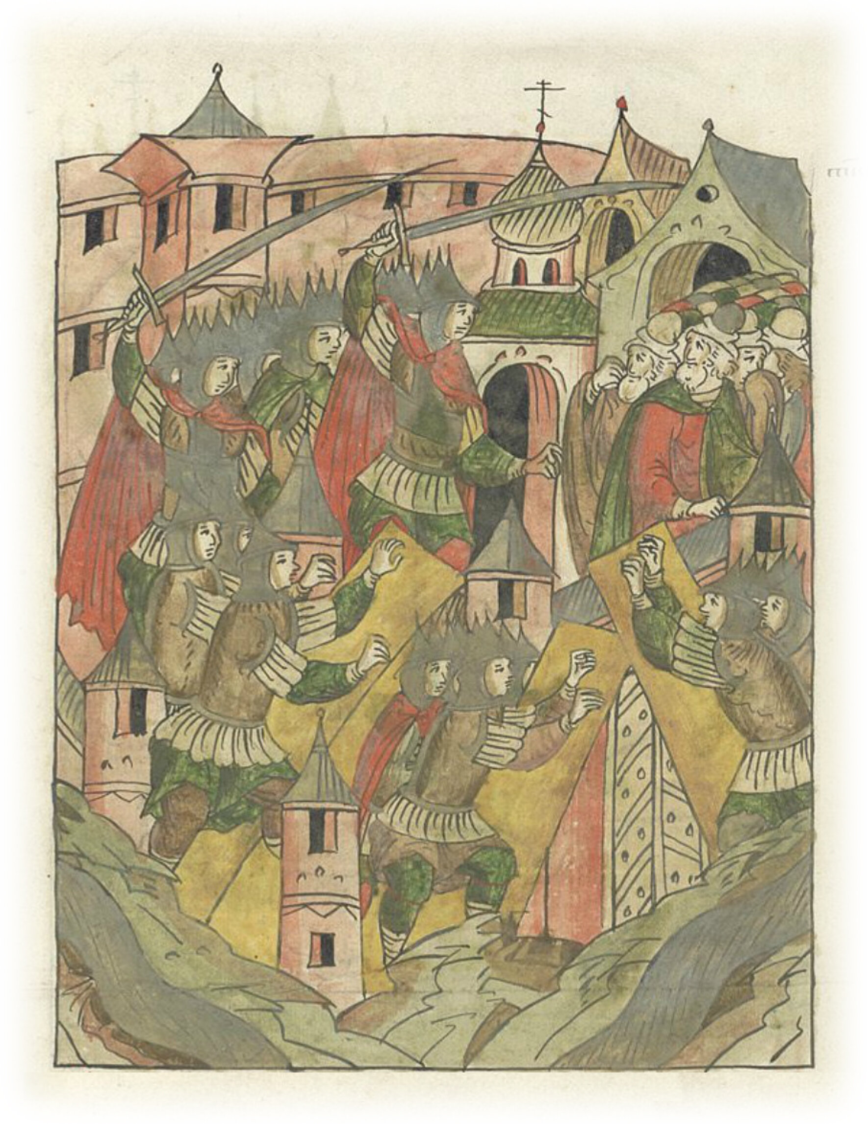 И так вошли по примету в город от Золотых ворот, также и от Лыбеди в Оринины ворота и в Медные, также и от Клязьмы в Волжские, и отовсюду всю стену разбив, вошли в него словно демоны,