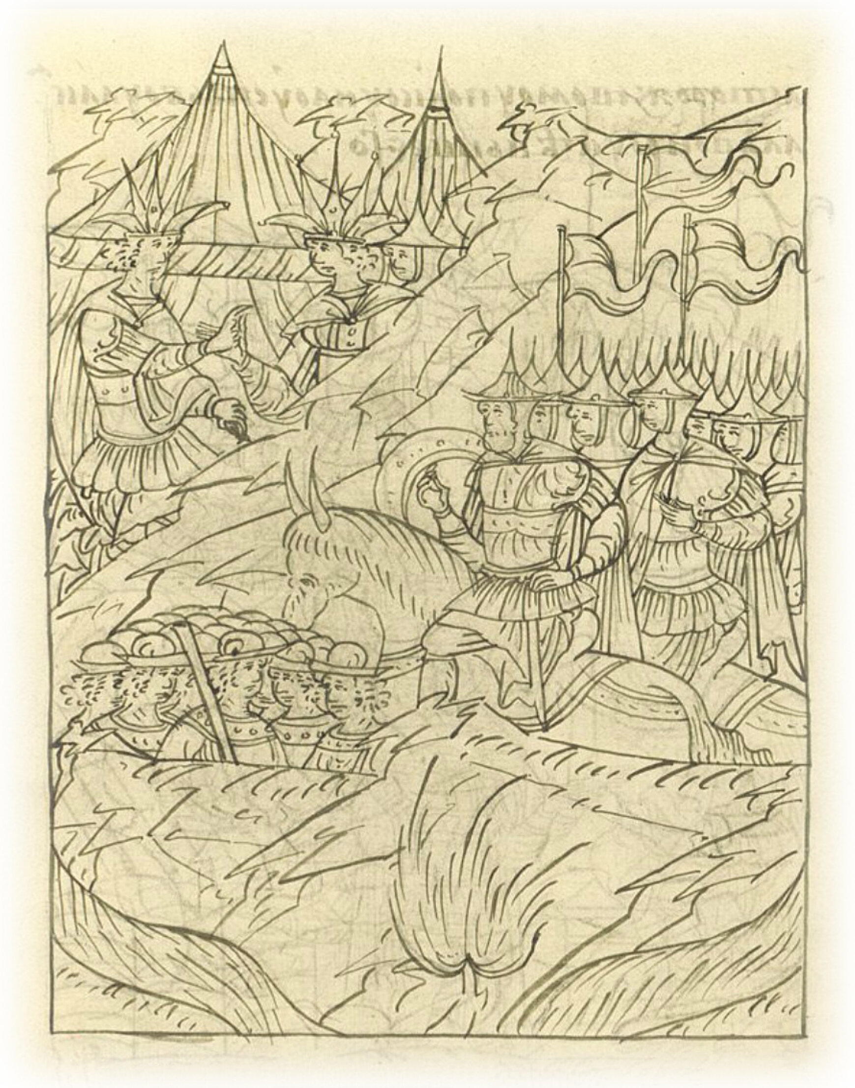 И приговорили: встать самому государю и князю Владимиру Андреевичу на Царевом лугу близ Отучевы мечети, а царю Шигалею за Булаком под кладбищем. И идти царю в большом полку, а на Арском поле встать большому полку да передовому, да князя Владимира Андреевича боярину и воеводе князю Юрию; а (полку) правой руки – за Казанью за рекой, да казакам с ними многим; а сторожевому полку – на устье Булака, а (полку) левой руки – выше его.
