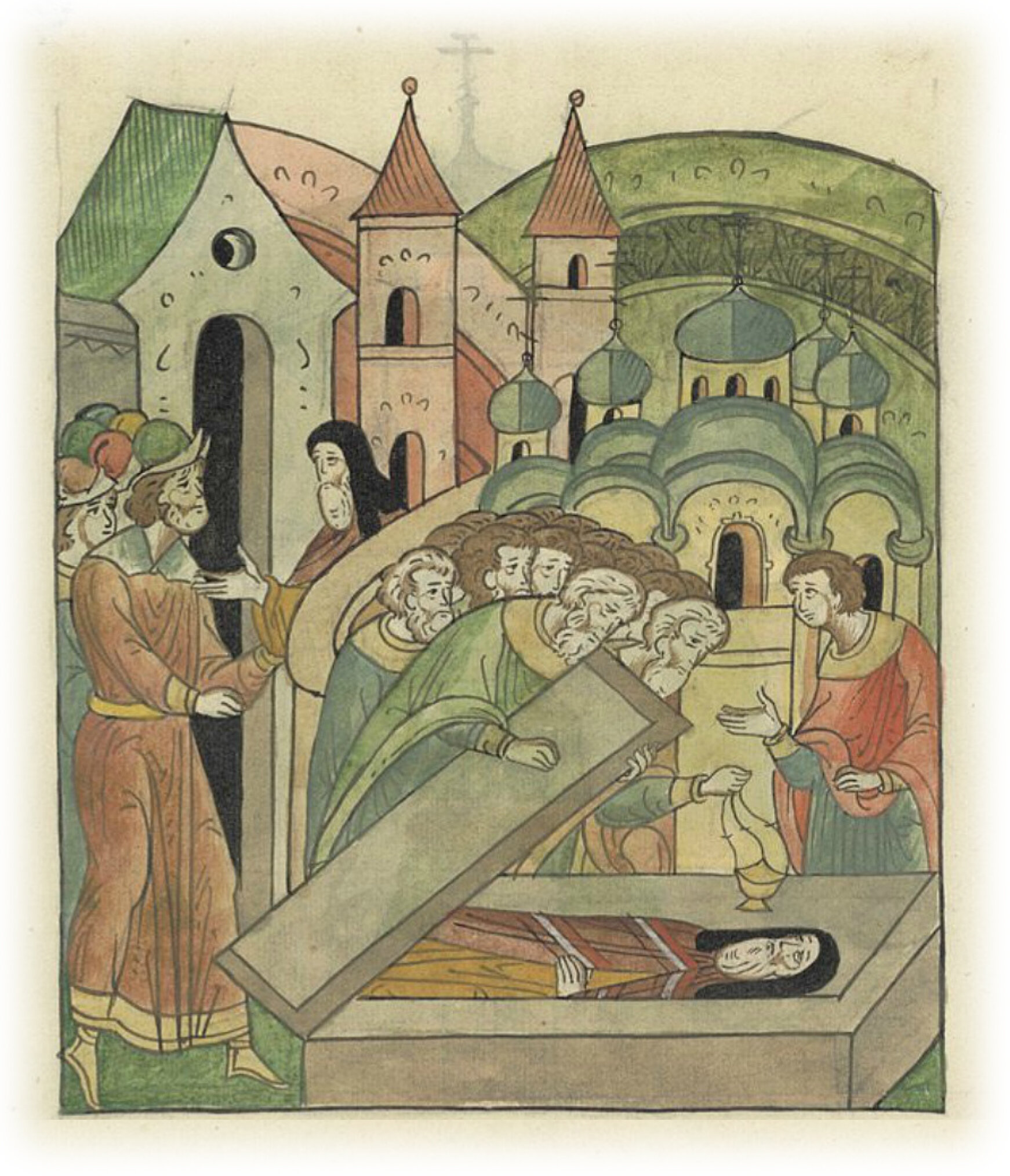 Кончина Новгородского архиепископа Митрофана и его похороны в притворе святой Софии. На епископский двор возводят Хутынского инока Арсения.