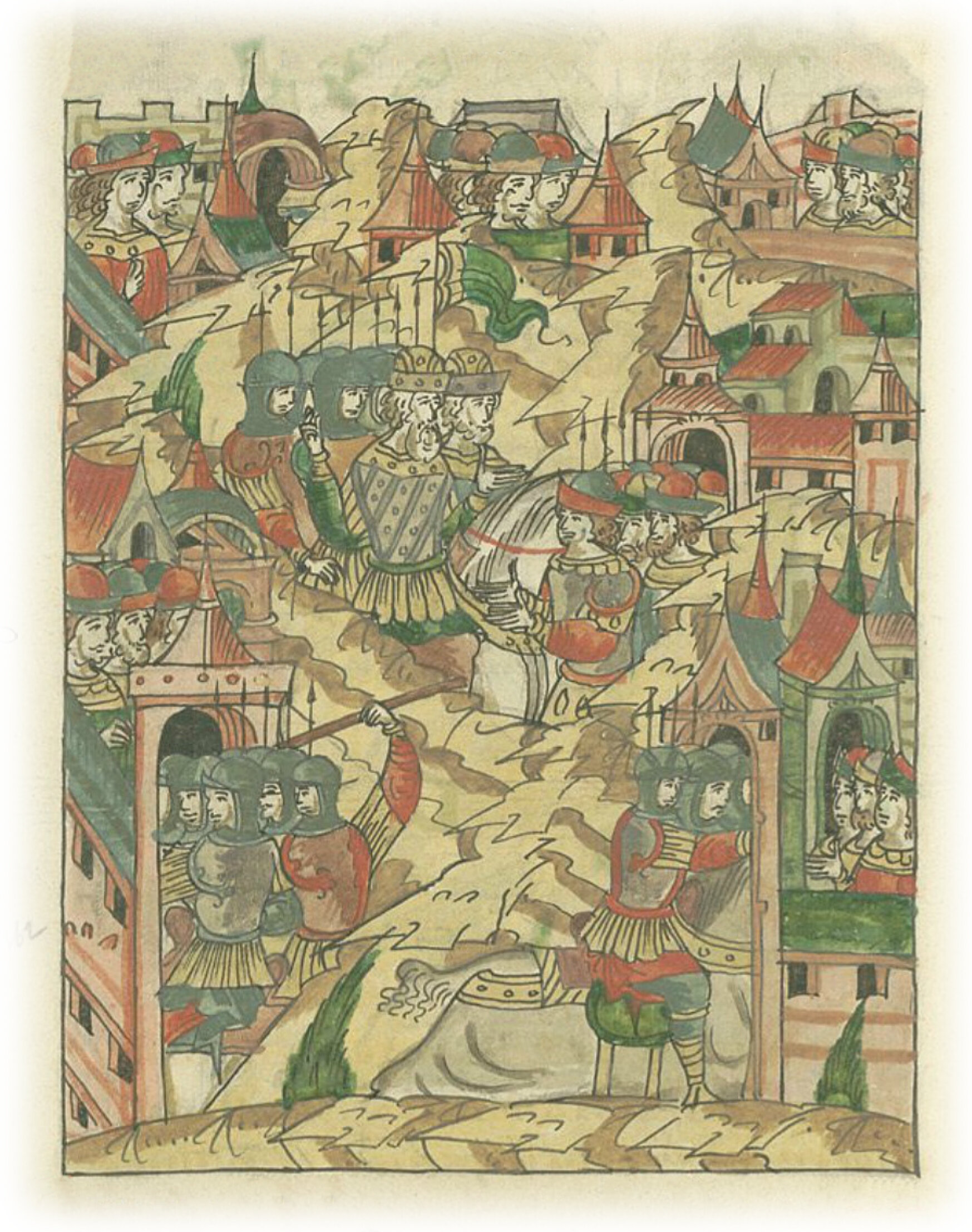 Языки говорят воеводам царя Ивана Васильевича, что магистр окопался большим рвом вокруг города Рындола, бьет из пушек и пищалей и приступает к Рындолу.