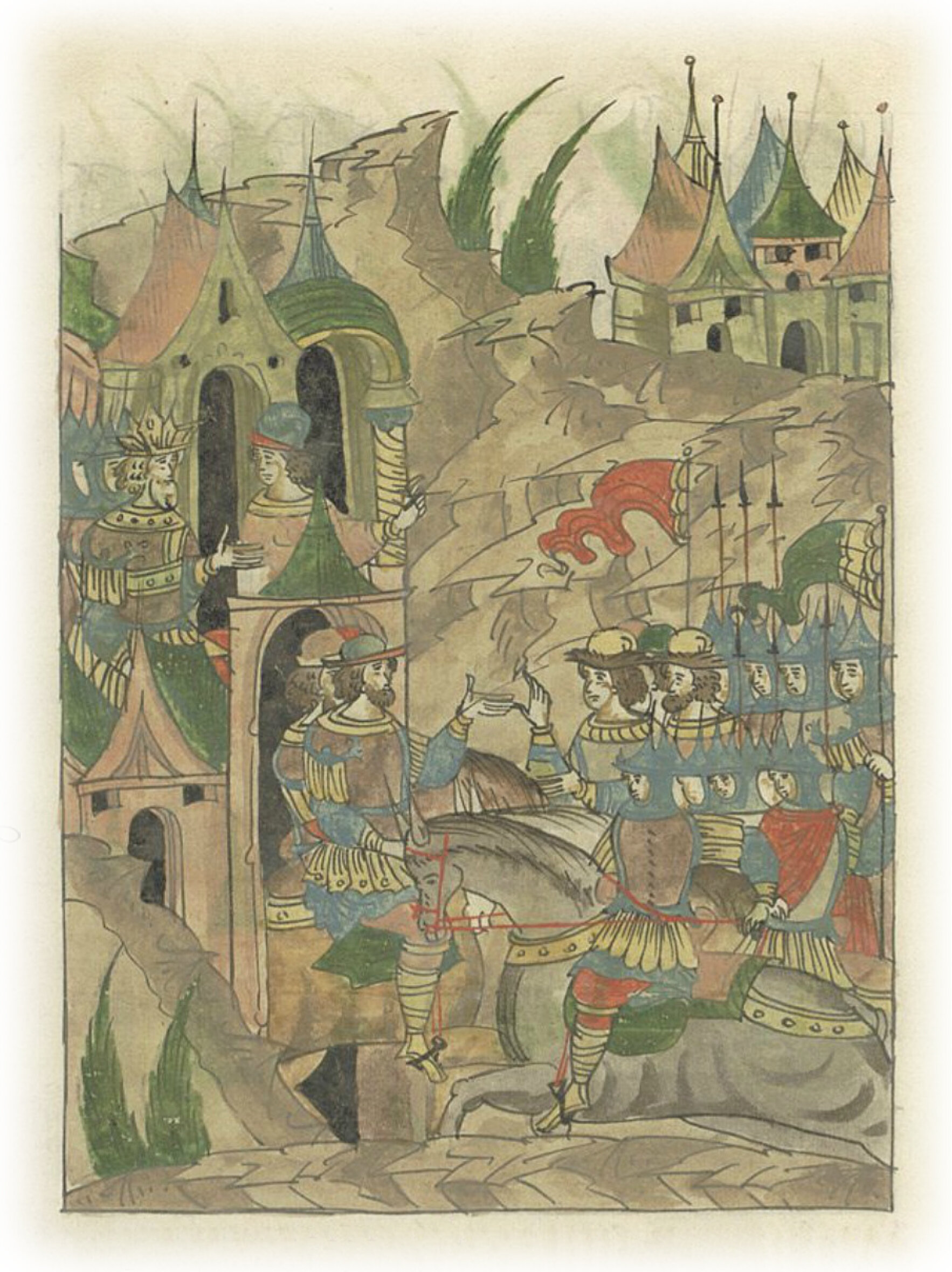Языки говорят воеводам царя Ивана Васильевича, что магистр окопался большим рвом вокруг города Рындола, бьет из пушек и пищалей и приступает к Рындолу.
