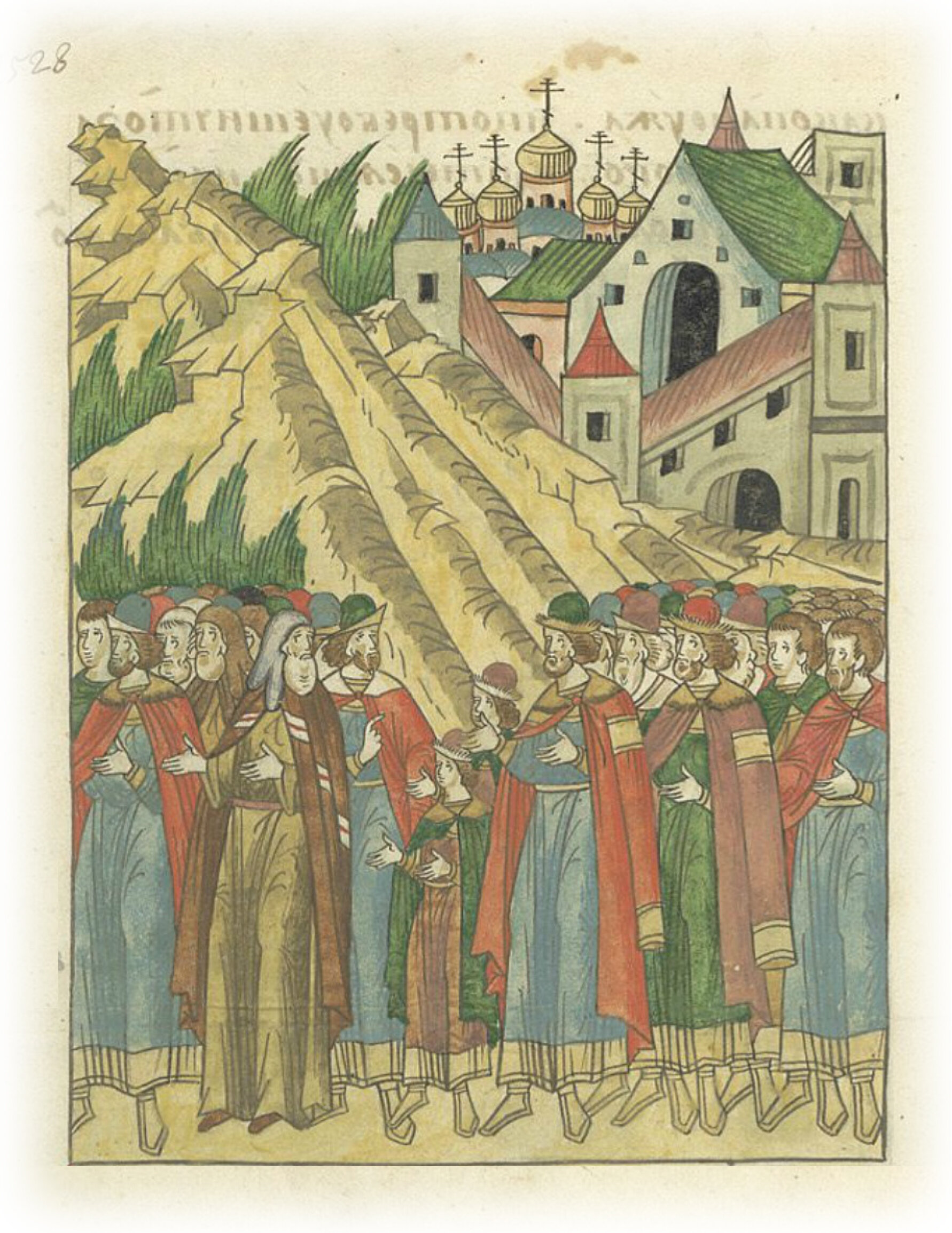 И проводили его с большими почестями и славой сам великий князь со своими детьми и боярами, также и все русские епископы и архимандриты, игумены и священники, иноки и купцы, зажиточные горожане* и простой народ. * Люди, относящиеся к городским зажиточным сословиям, а также несущие службу при дворе князя или в уездных городах, боярские дети.