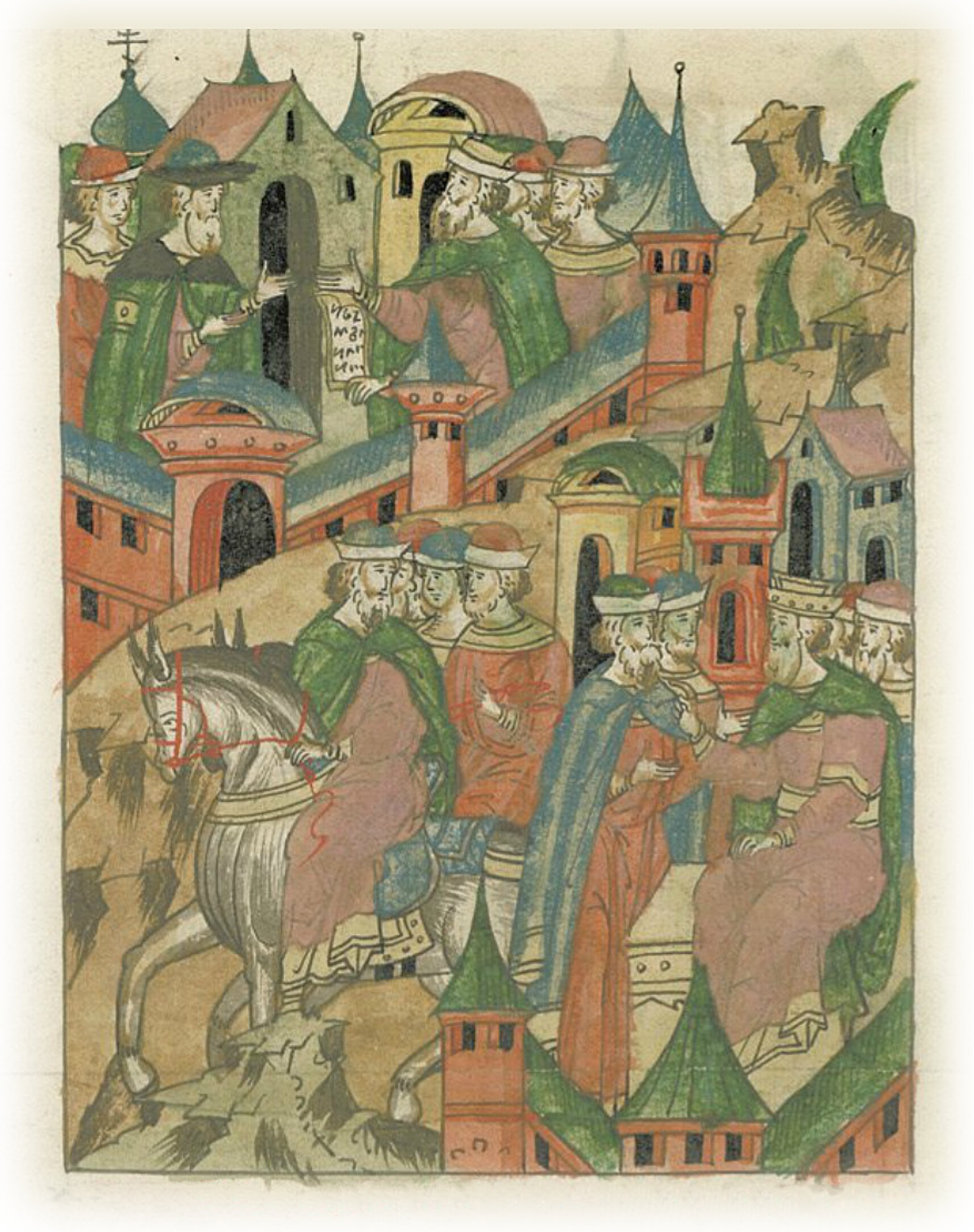 О послах литовских и о войне. В 7026 (1517) году в сентябре король Польский Жидимонт, поразмыслив своим коварным помыслом, послал к великому государю Василию послов своих, маршалка своего и наместника могилевского пана Яна Щита, да маршалка же и писаря своего Богуша.