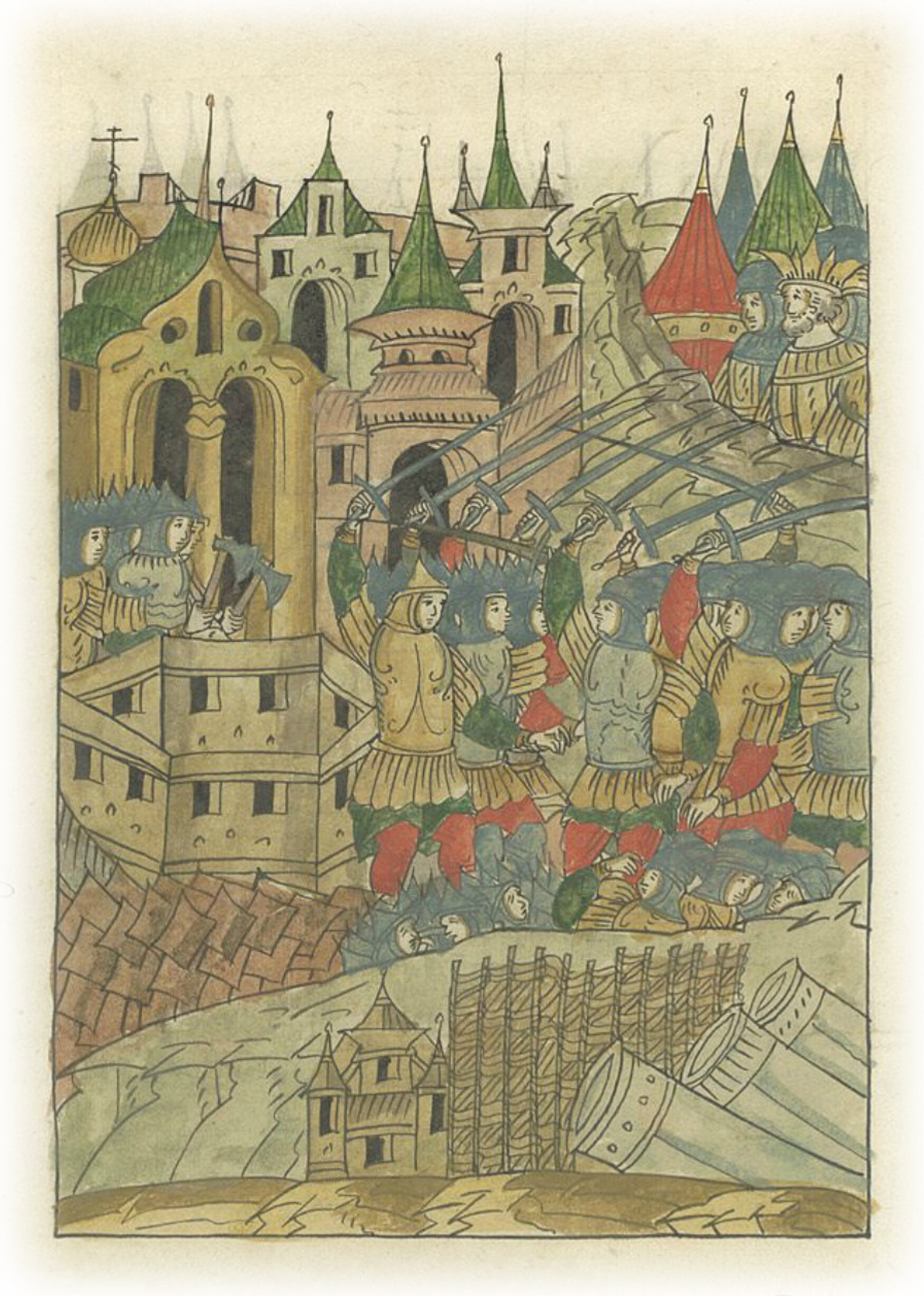 Увидели турки строящих башню, и вскоре наскочило их множество на разрушенное место, греки также (выступили) против них, и была брань великая.