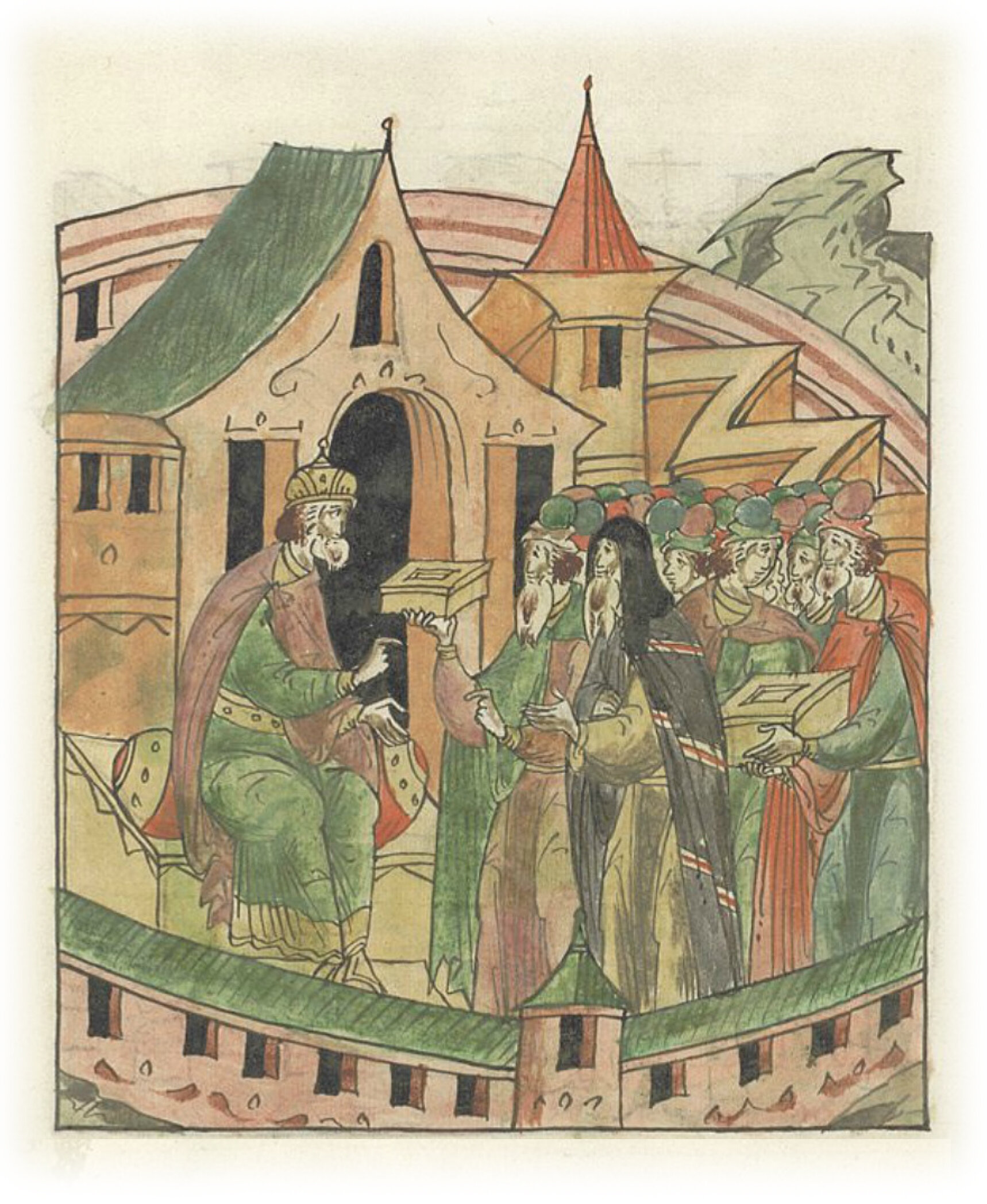 Ругодивские посадники Яким и Захар приезжают в Москву. Воеводы царя Ивана Васильевича Алексей Адашев и Иван Михайлов сообщают им, что государь пожалует их, если сдадут его воеводам помимо Ругодива Вышгород.