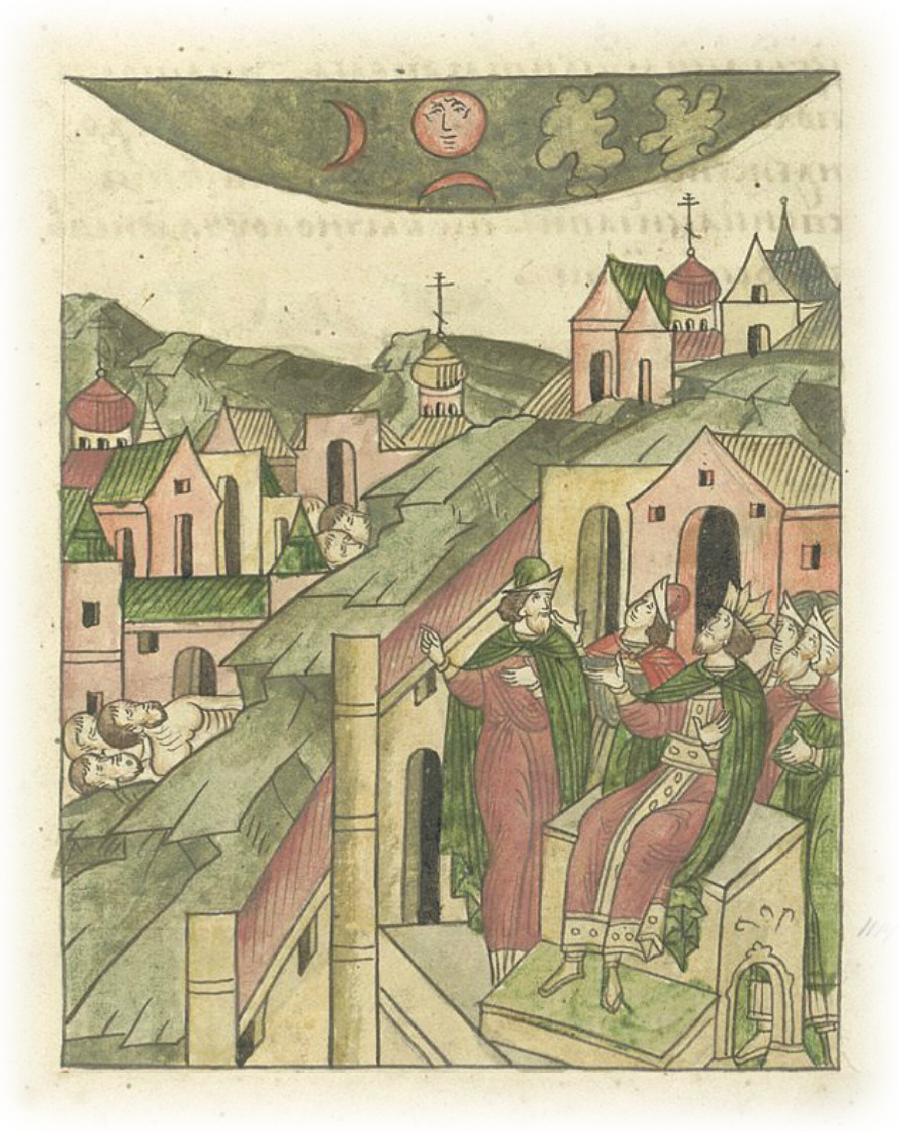 И, не терпя этого, солнце скрыло свои лучи месяца августа в 7 день, в 3 часа пополудни. И стало тогда солнце размером с трехдневный месяц, ущербно было с полуденной стороны, и тьма синяя и зеленая приходила с запада. И продлилась тьма один час, повернуло солнце свои лучи на полдень, как молодой месяц, а затем обратило лучи к земле и стало как месяц, наступила великая тьма. А потом понемногу солнце стало испускать свет, пока не набрало полную силу и не явило свой свет в полной мере.