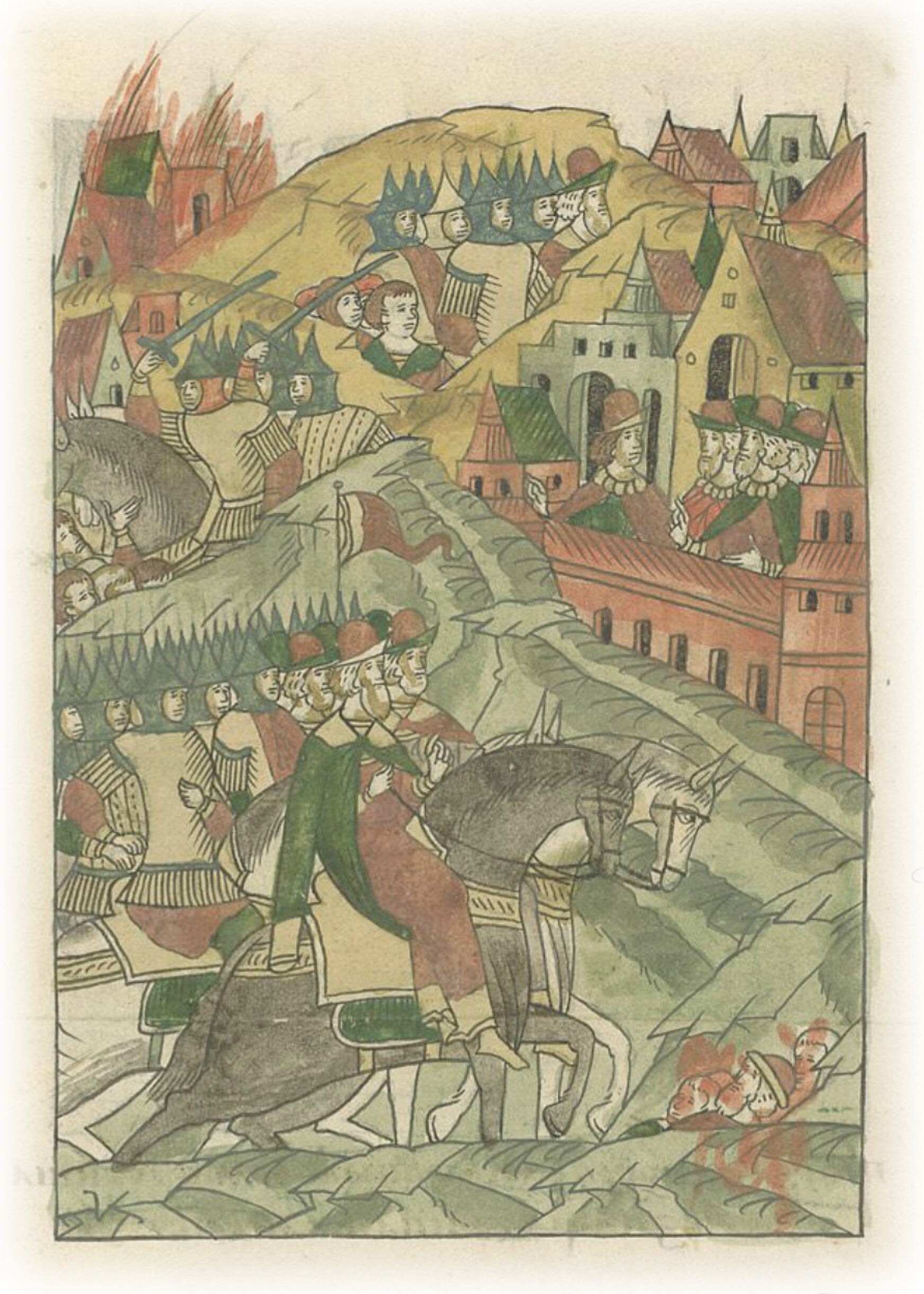 Языки говорят воеводам царя Ивана Васильевича, что магистр окопался большим рвом вокруг города Рындола, бьет из пушек и пищалей и приступает к Рындолу.