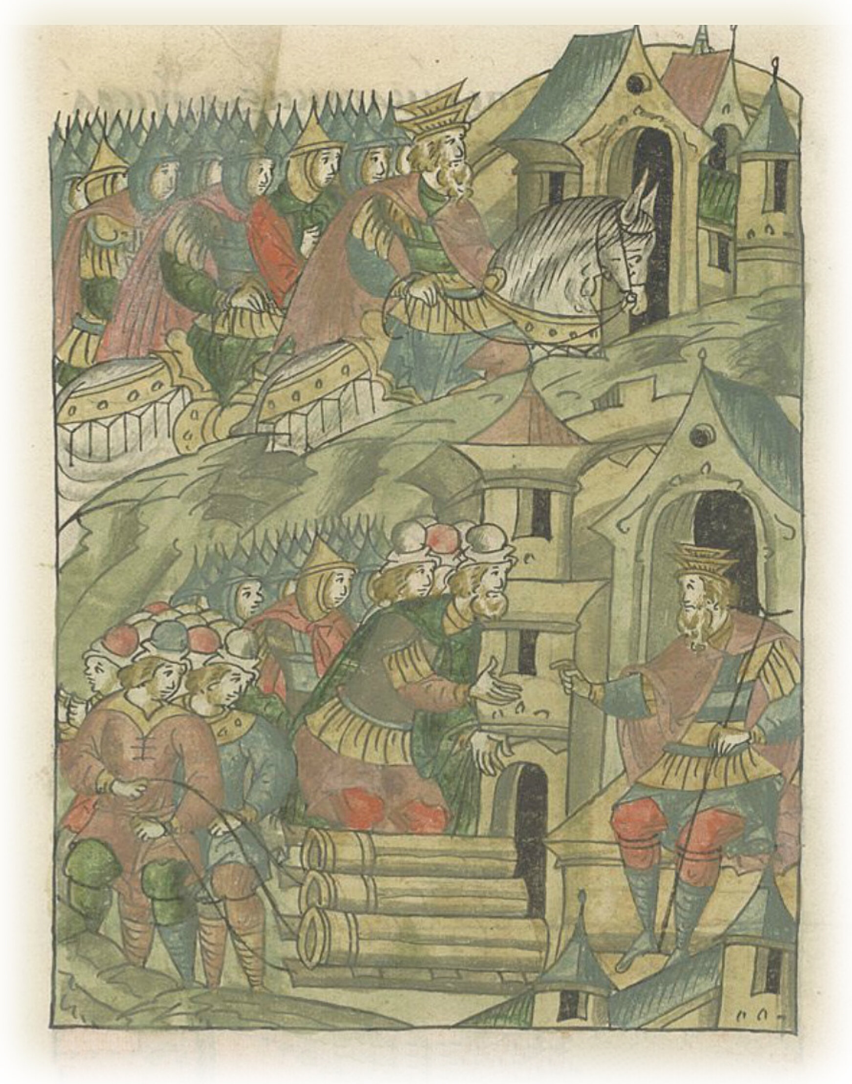 А сам король Жидимонт пошел в Полоцк со всеми своими людьми польскими и литовскими и оттуда, подготовив к войне своих воевод – большого гетмана князя Константина Острожского и всех своих гетманов и польских и литовских воевод, да добыв многих наемных людей, послал с великим пушечным снаряжением