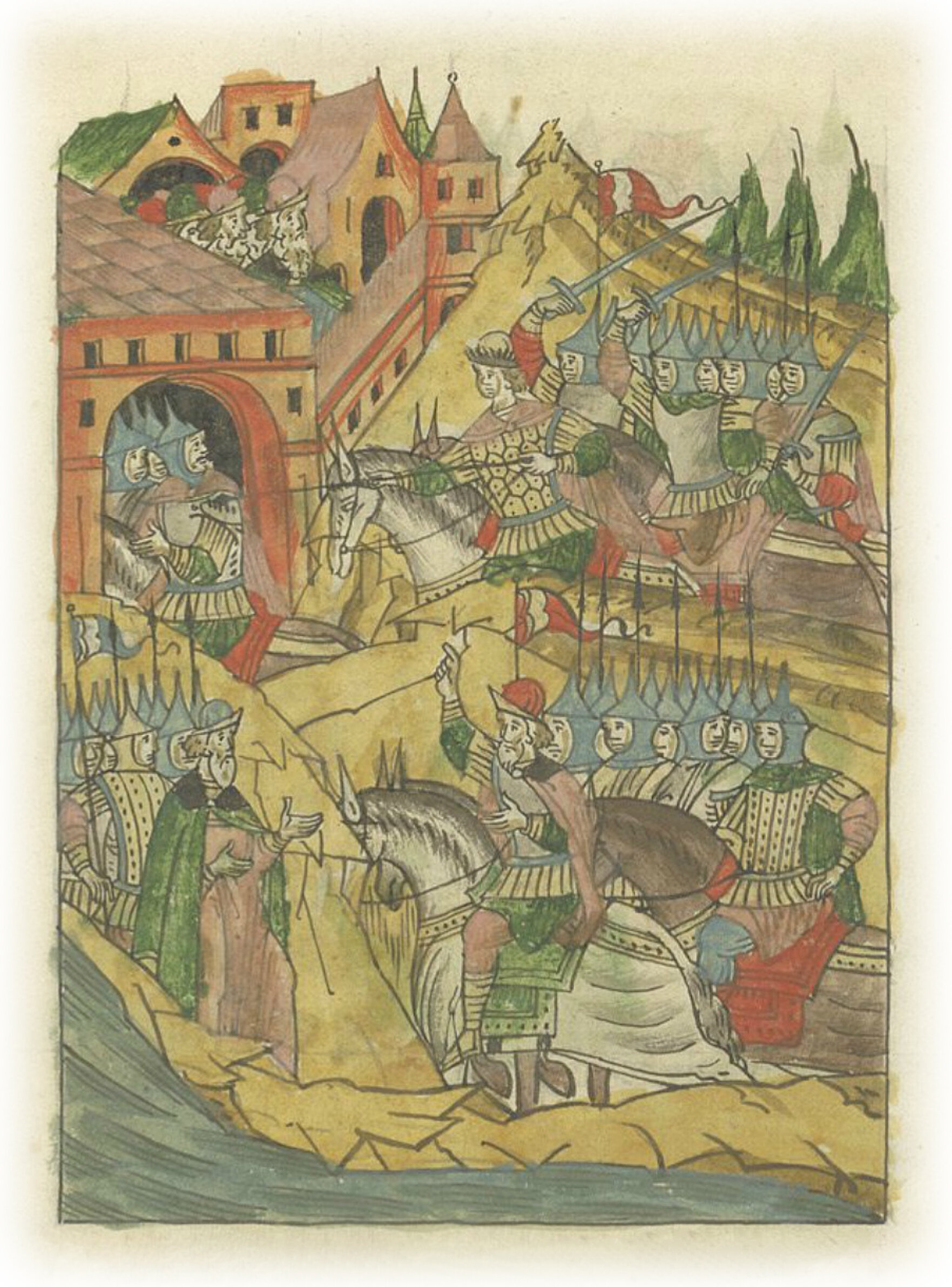 Языки говорят воеводам царя Ивана Васильевича, что магистр окопался большим рвом вокруг города Рындола, бьет из пушек и пищалей и приступает к Рындолу.